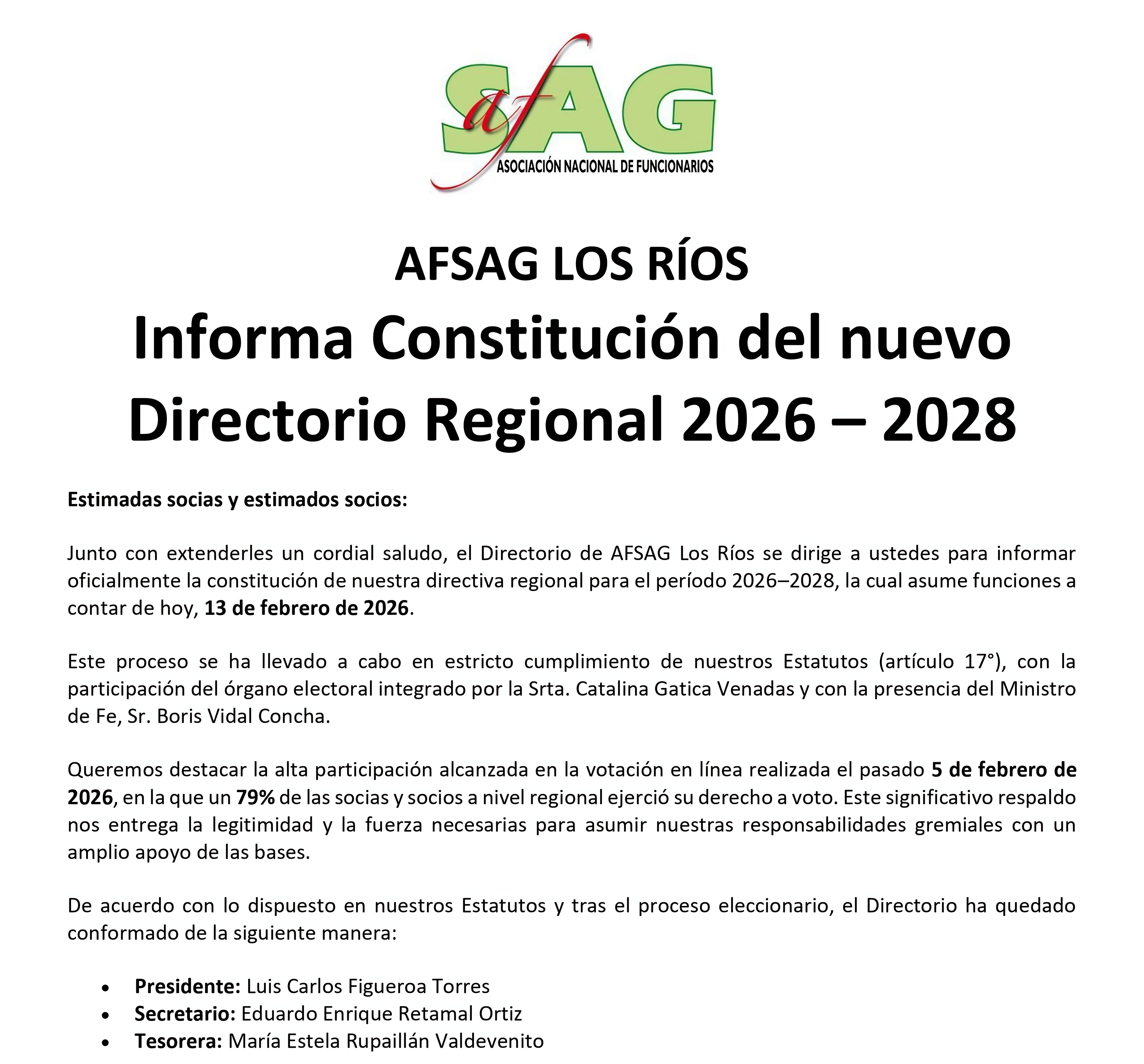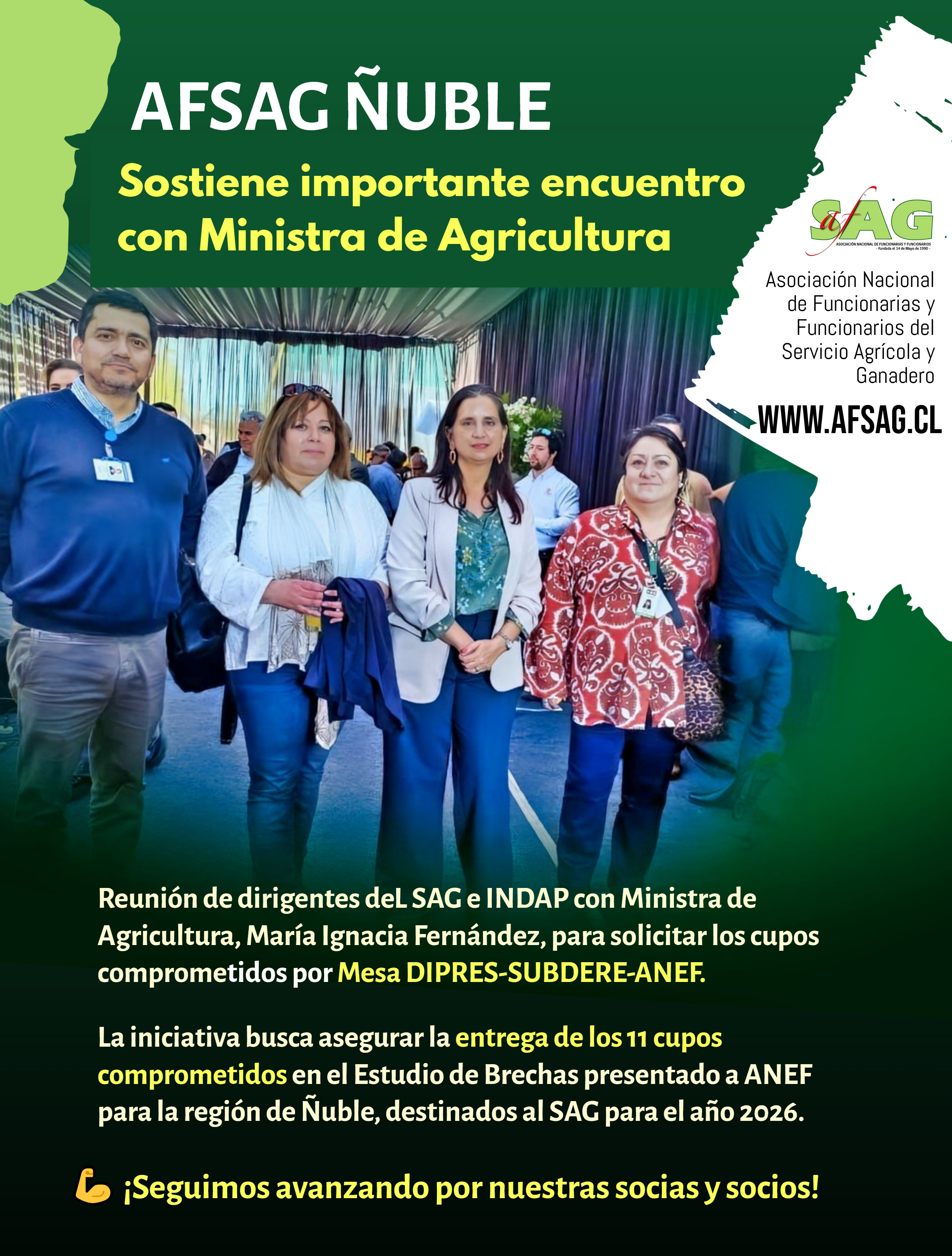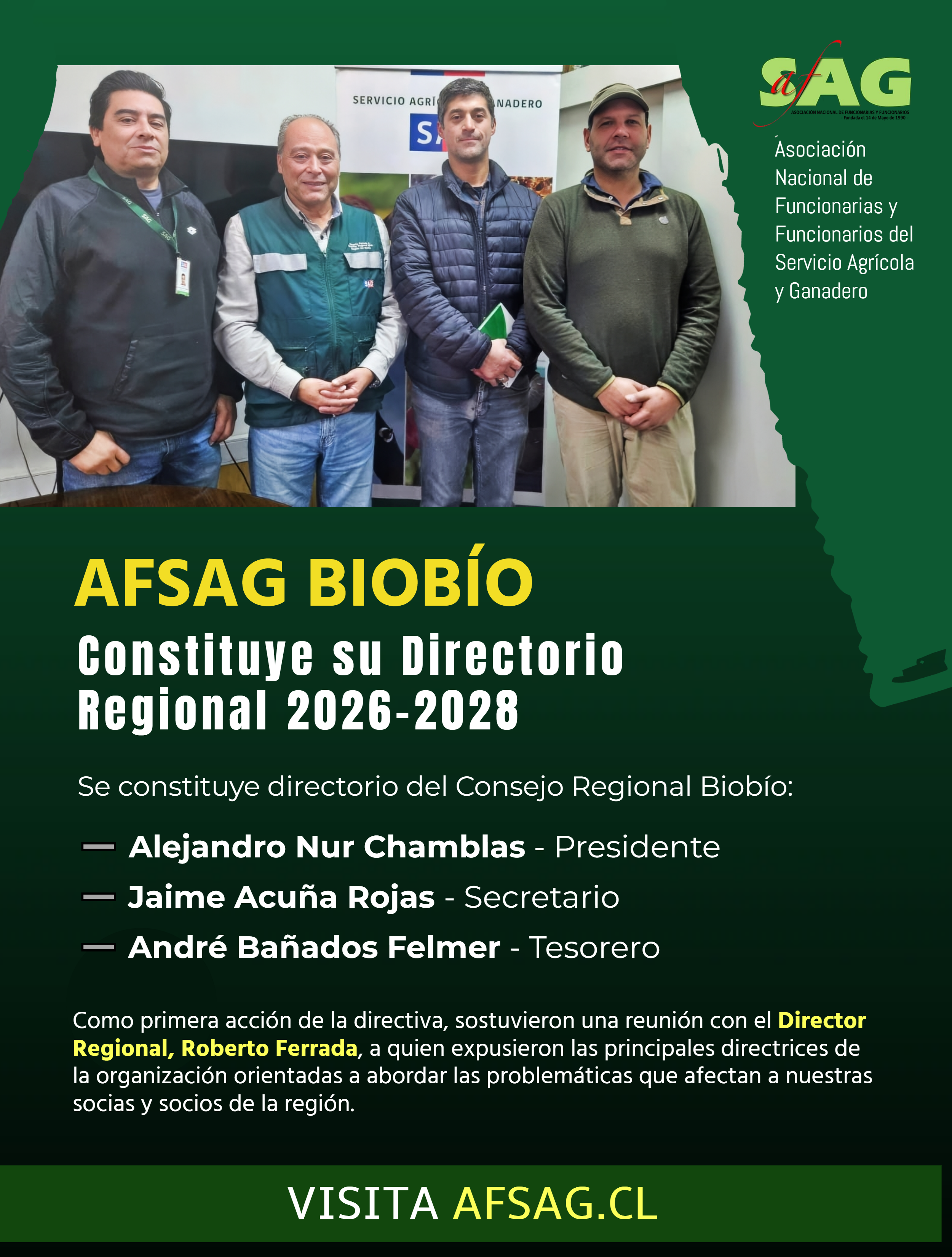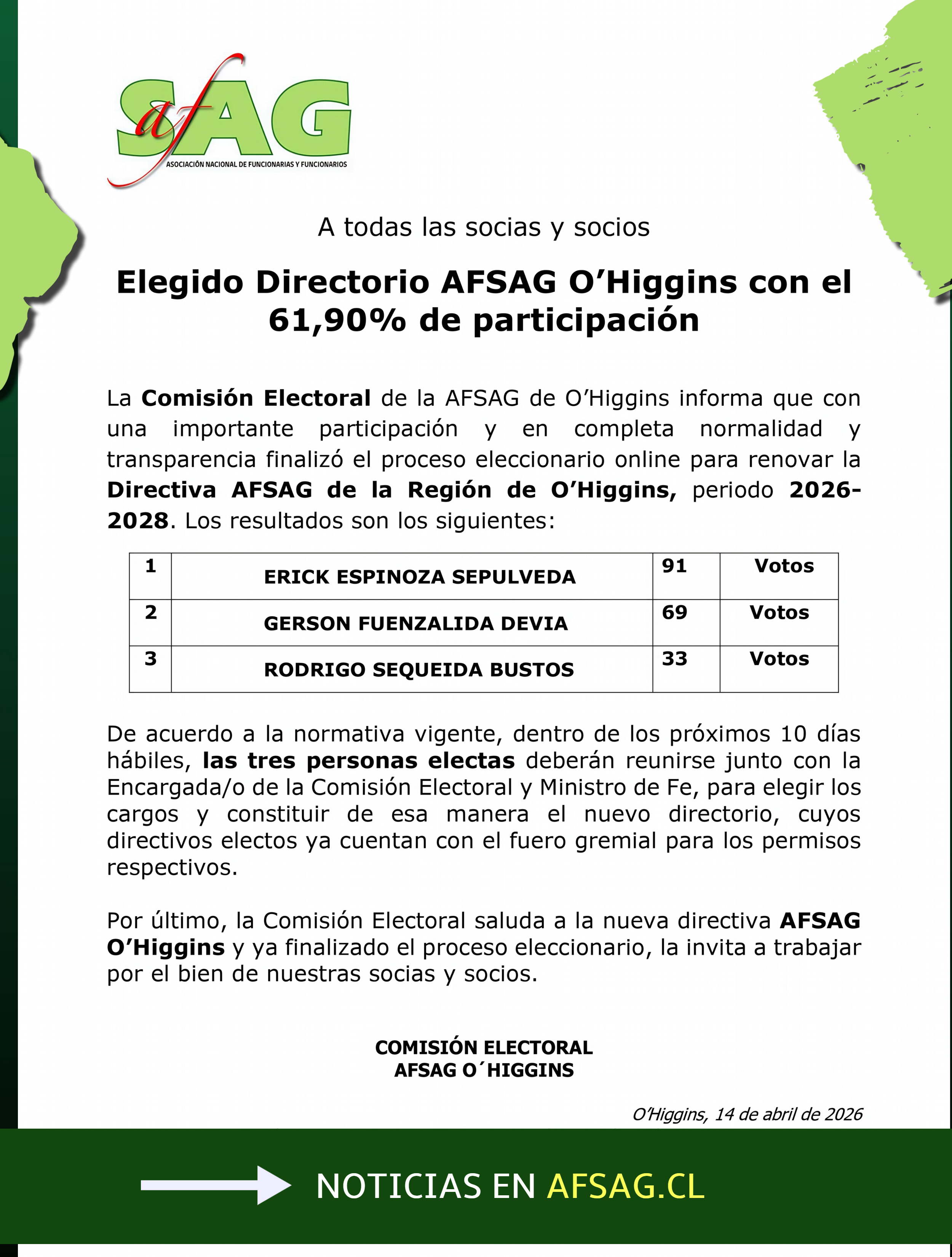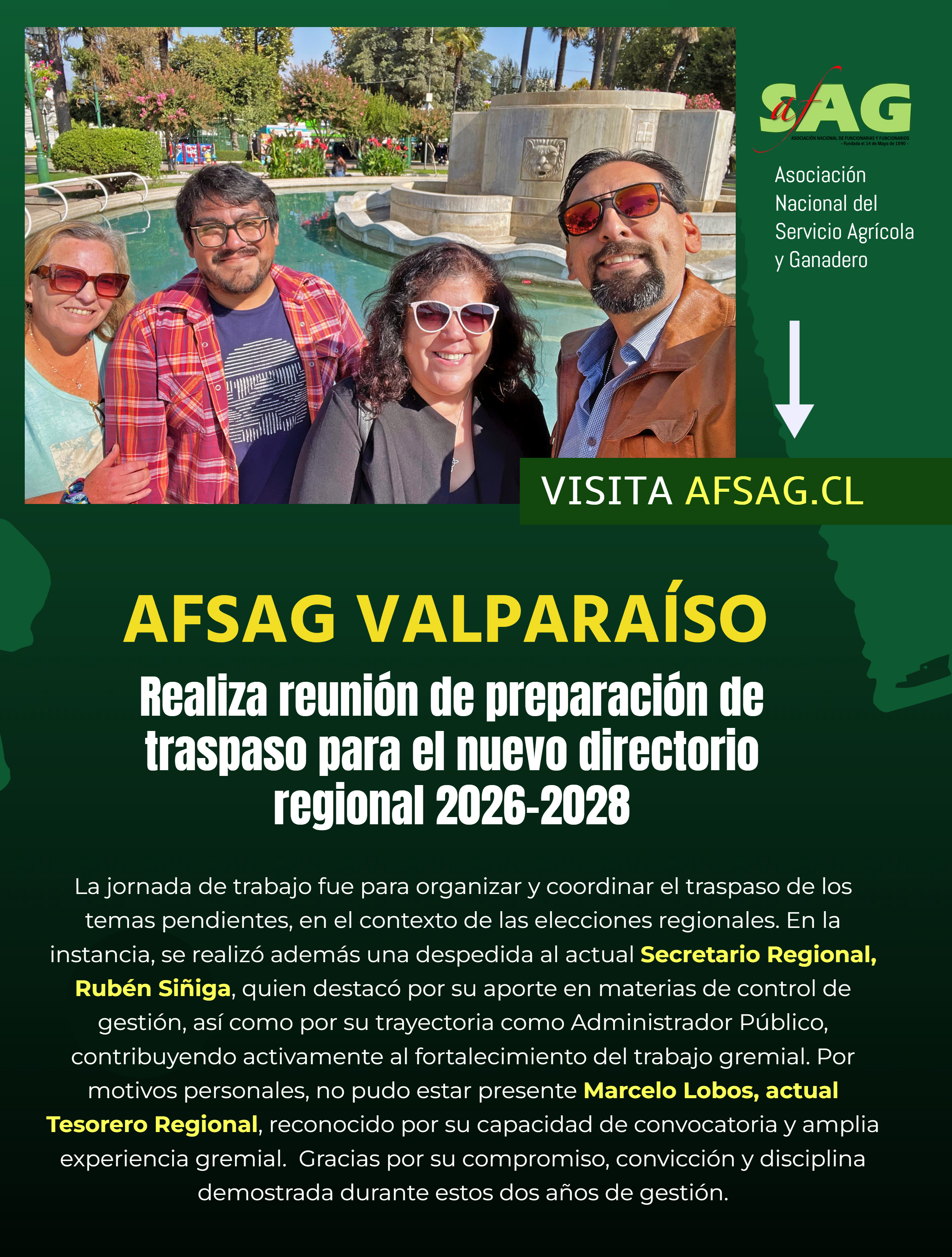 Asociación Nacional de Funcionarias y Funcionarios del Servicio Agrícola y GanaderoFONOS OFICINA AFSAG: 2 64 65 15 70 2 64 65 15 71 2 64 65 15 73 ----- afsag@afsag.cl PASEO BULNES 120 OFICINA 81 - Santiago, Chile