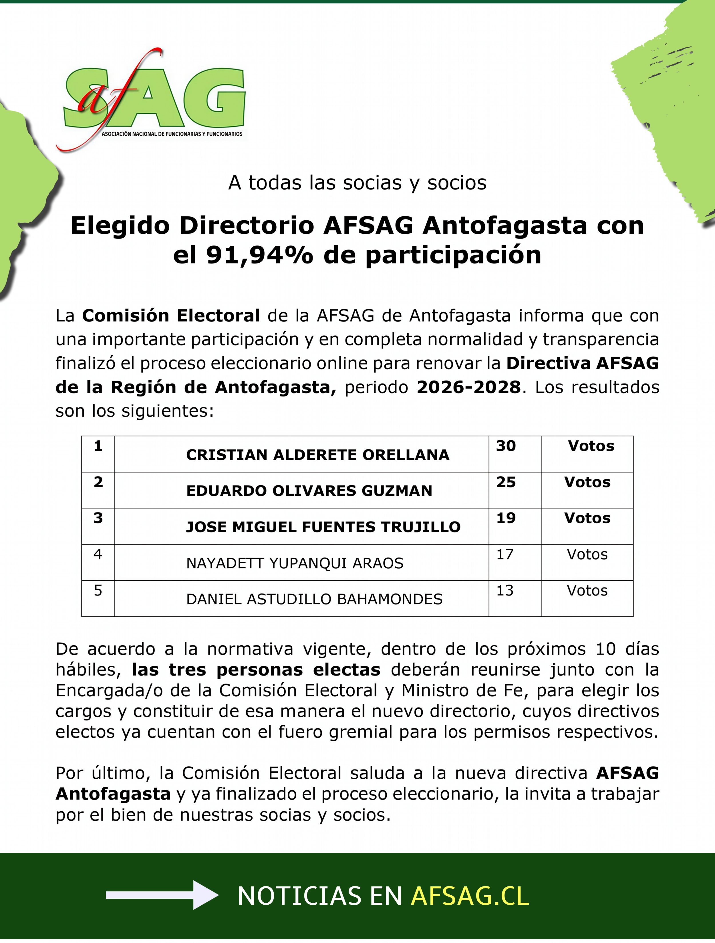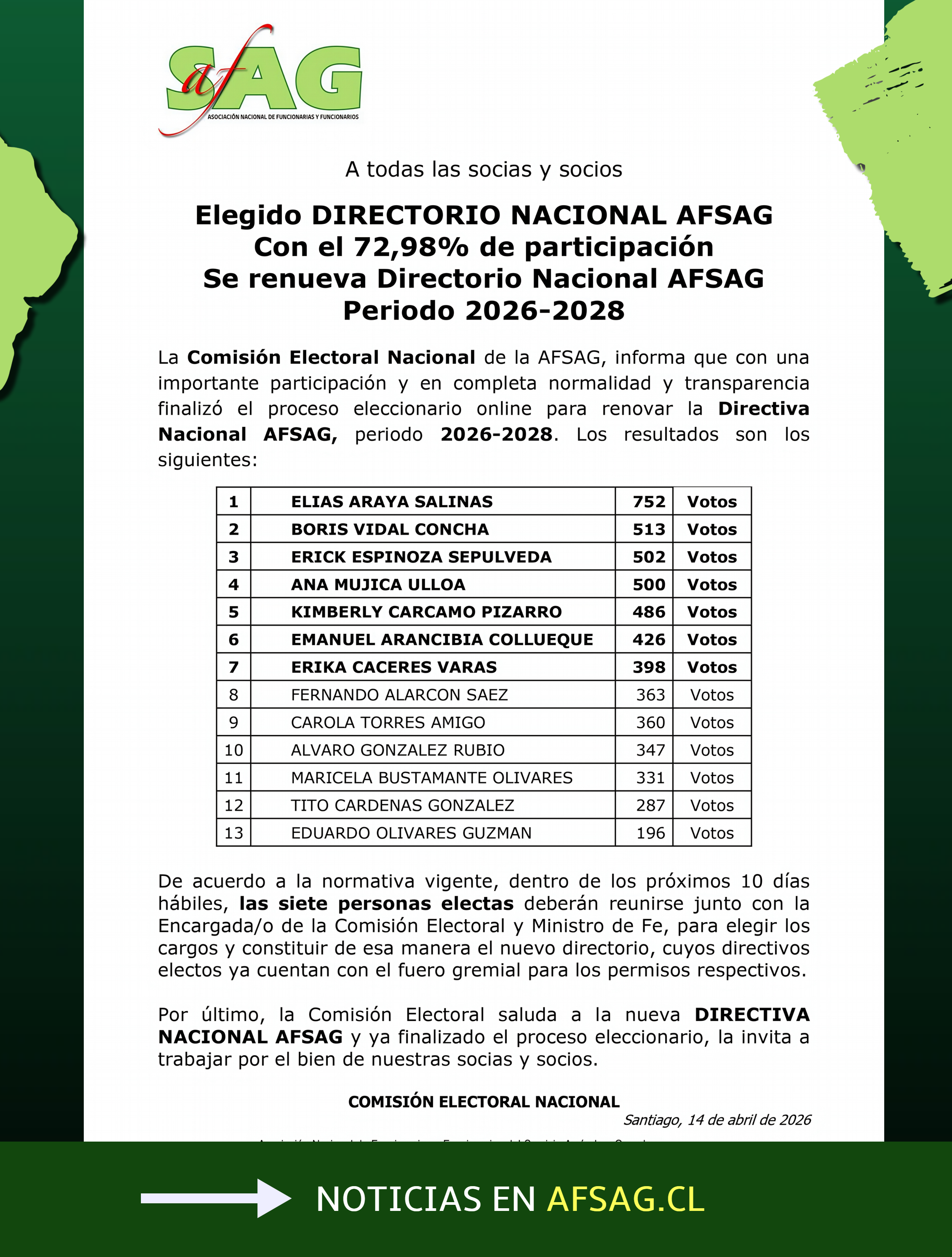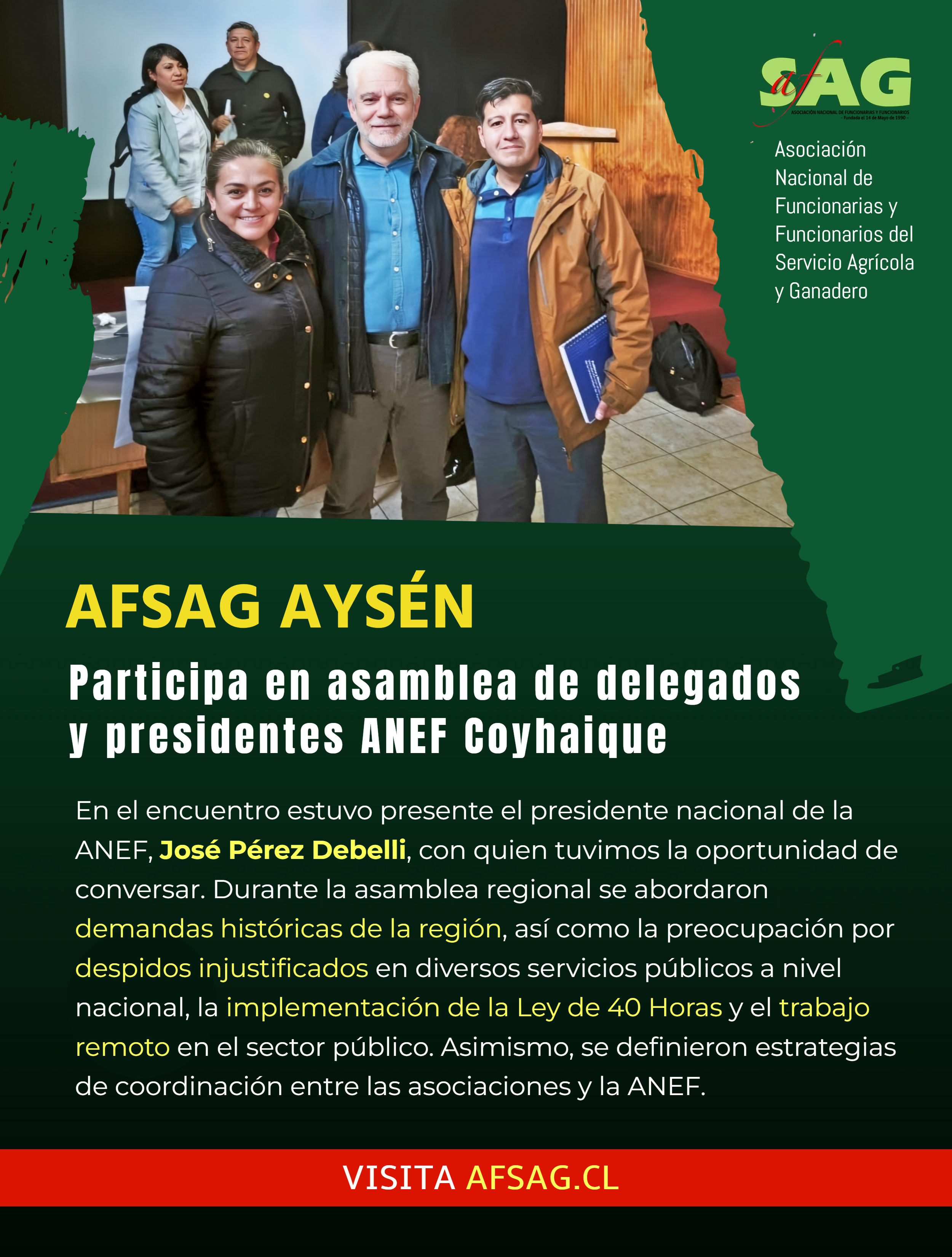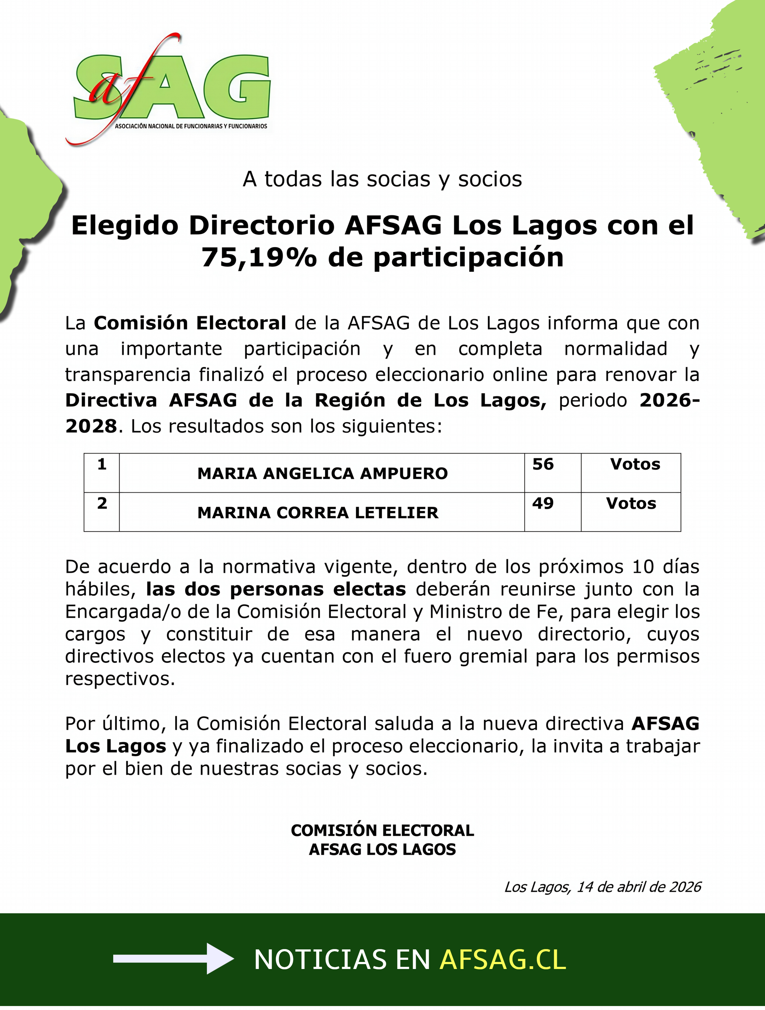 Asociación Nacional de Funcionarias y Funcionarios del Servicio Agrícola y GanaderoFONOS OFICINA AFSAG: 2 64 65 15 70 2 64 65 15 71 2 64 65 15 73 ----- afsag@afsag.cl PASEO BULNES 120 OFICINA 81 - Santiago, Chile