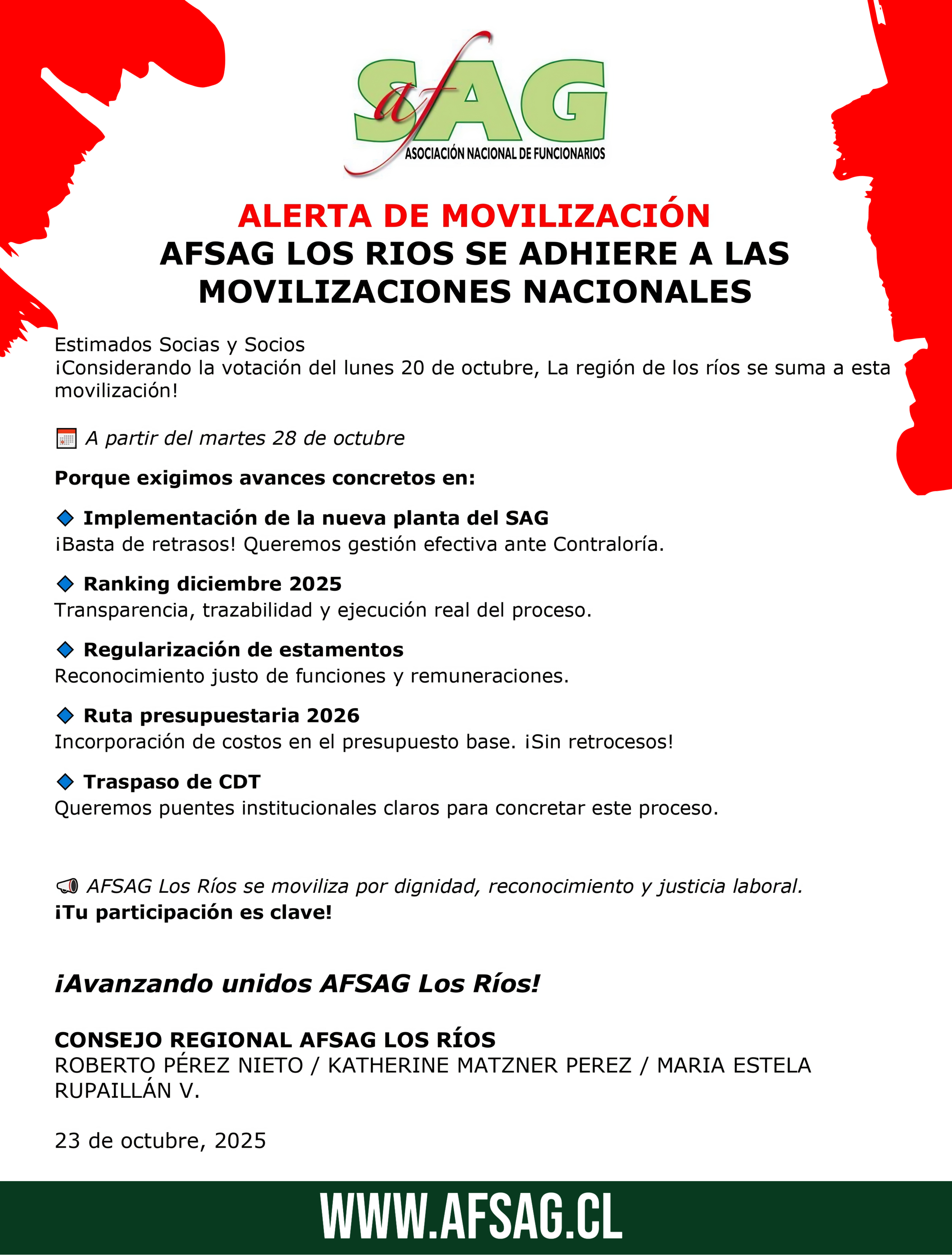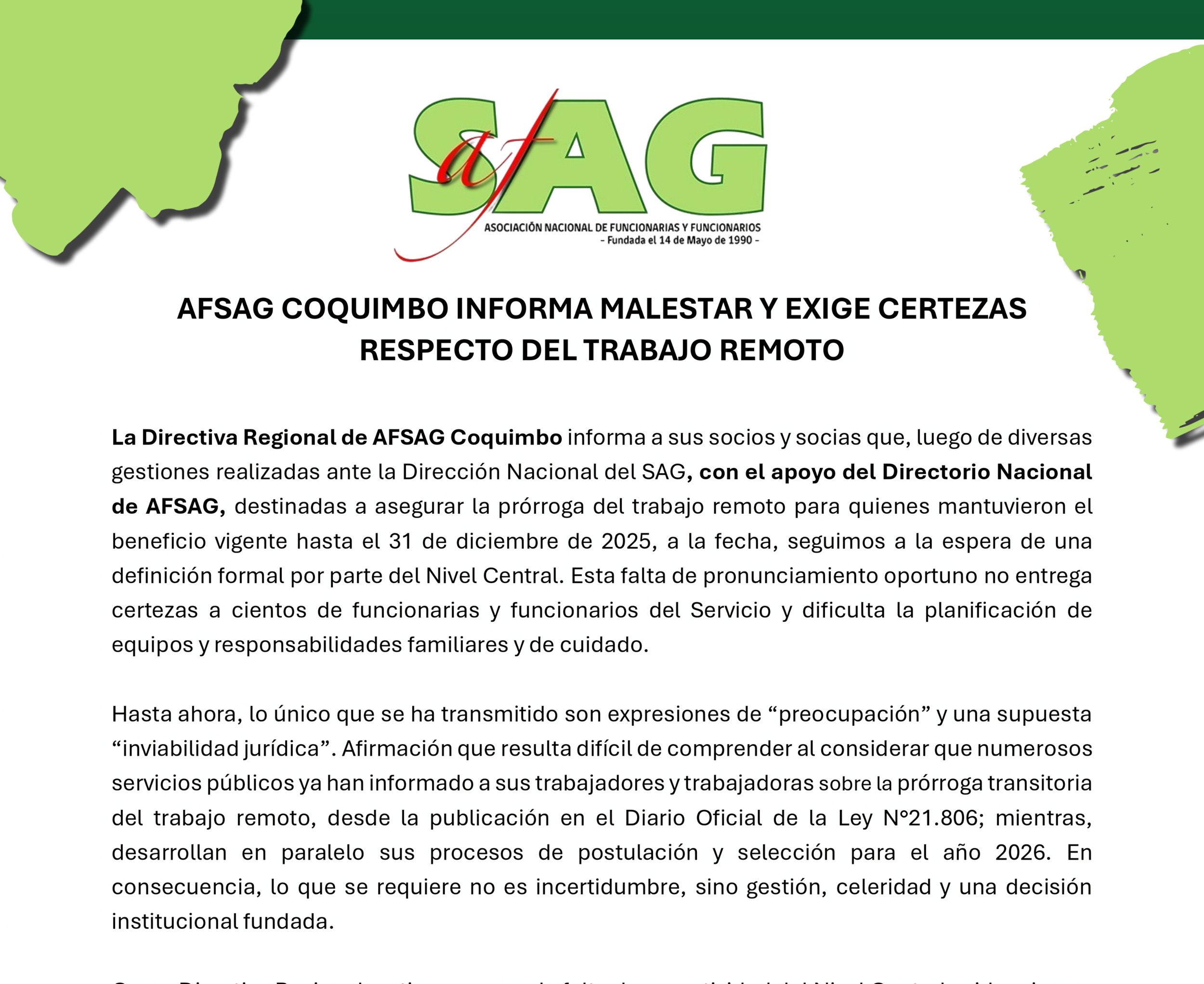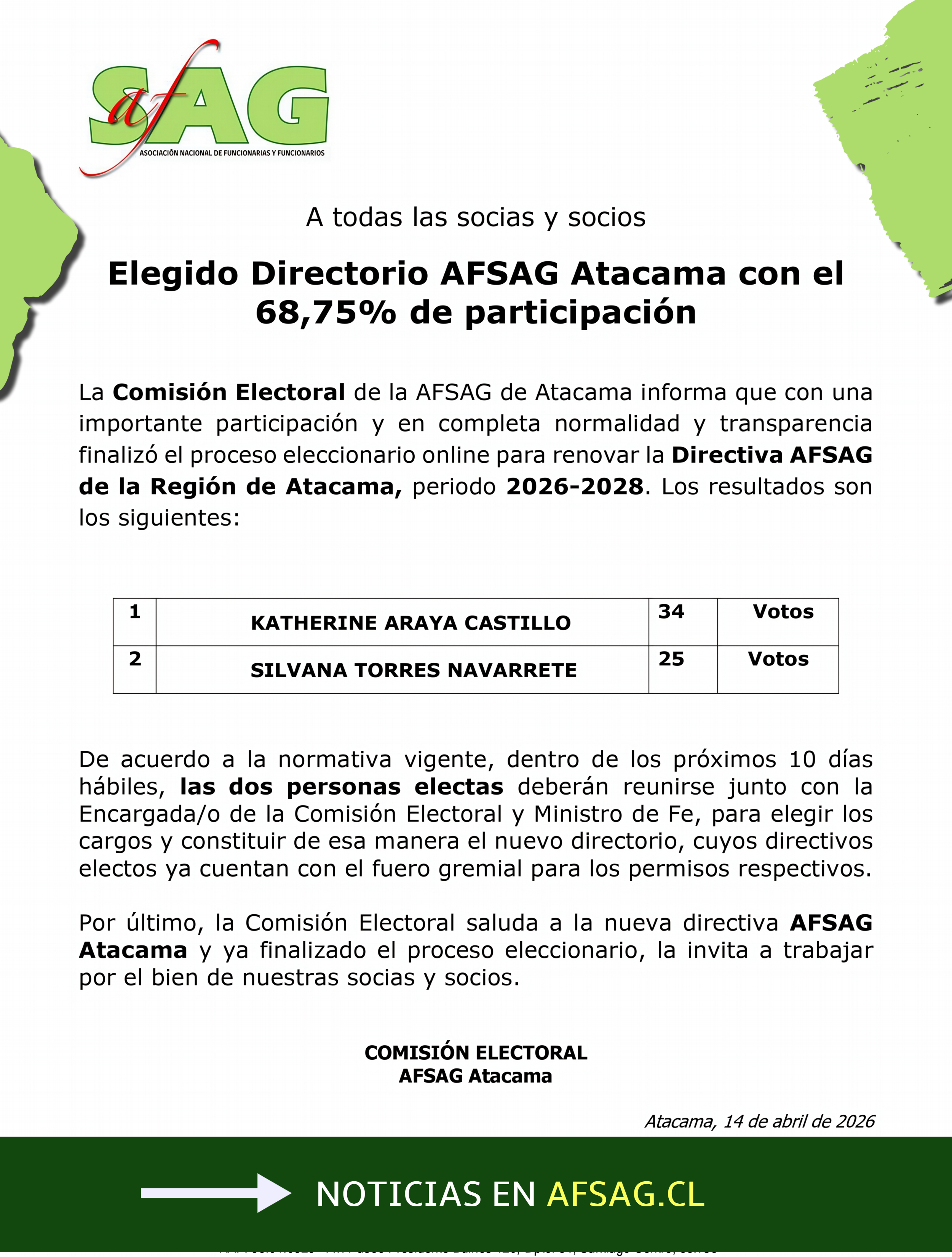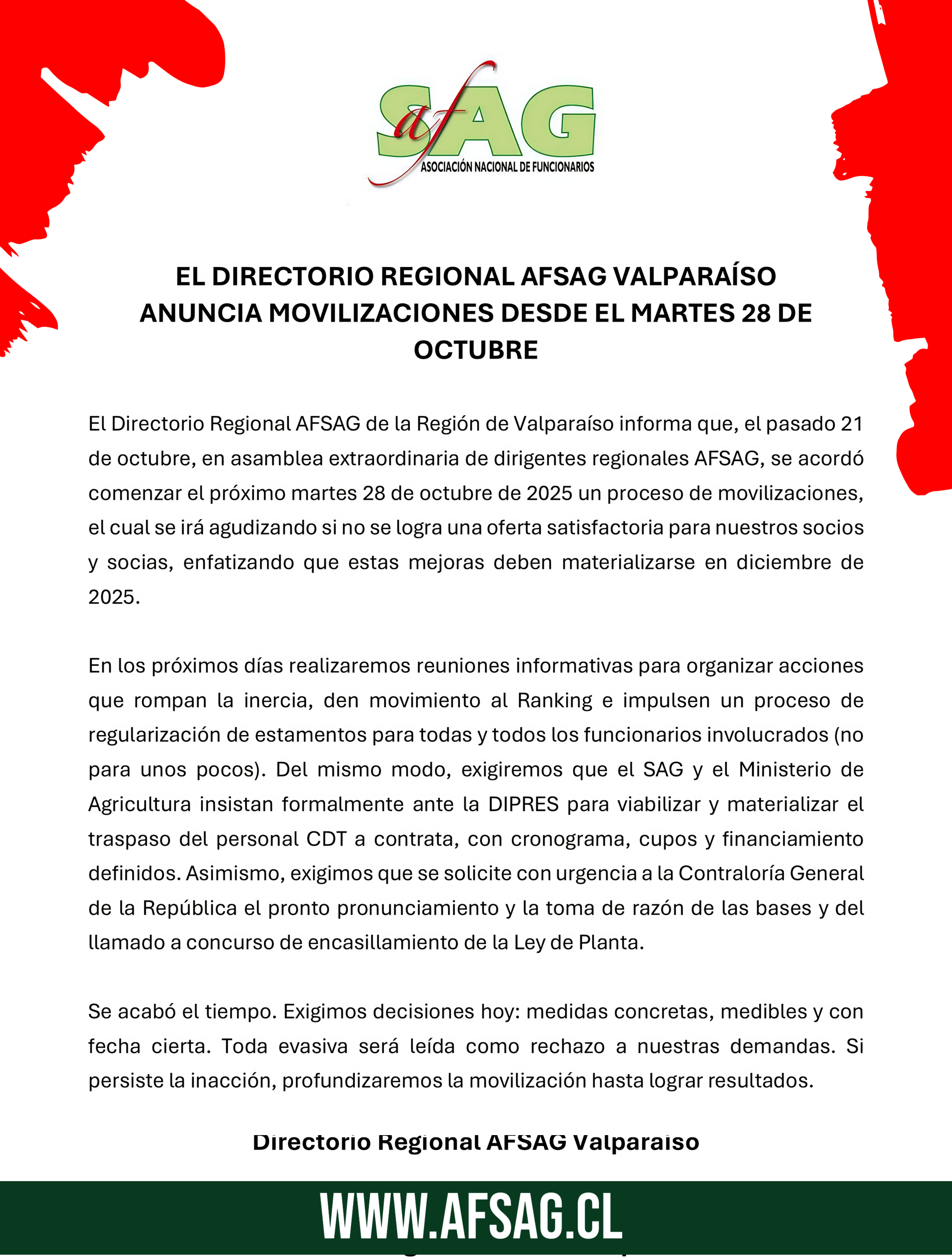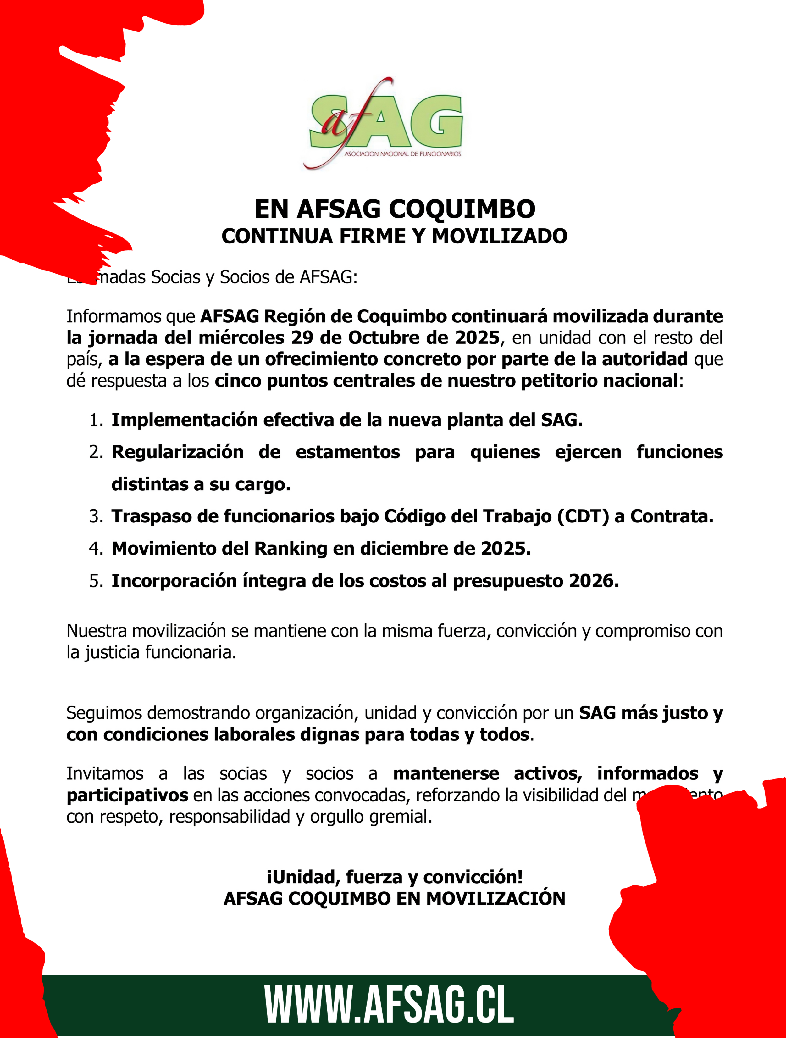 Asociación Nacional de Funcionarias y Funcionarios del Servicio Agrícola y GanaderoFONOS OFICINA AFSAG: 2 64 65 15 70 2 64 65 15 71 2 64 65 15 73 ----- afsag@afsag.cl PASEO BULNES 120 OFICINA 81 - Santiago, Chile