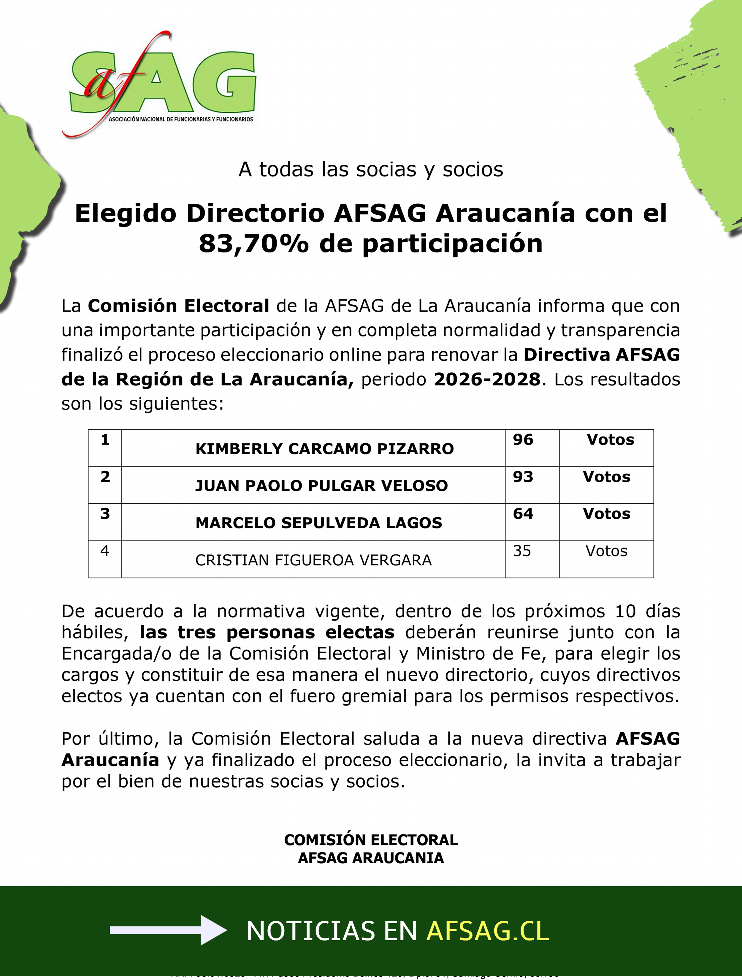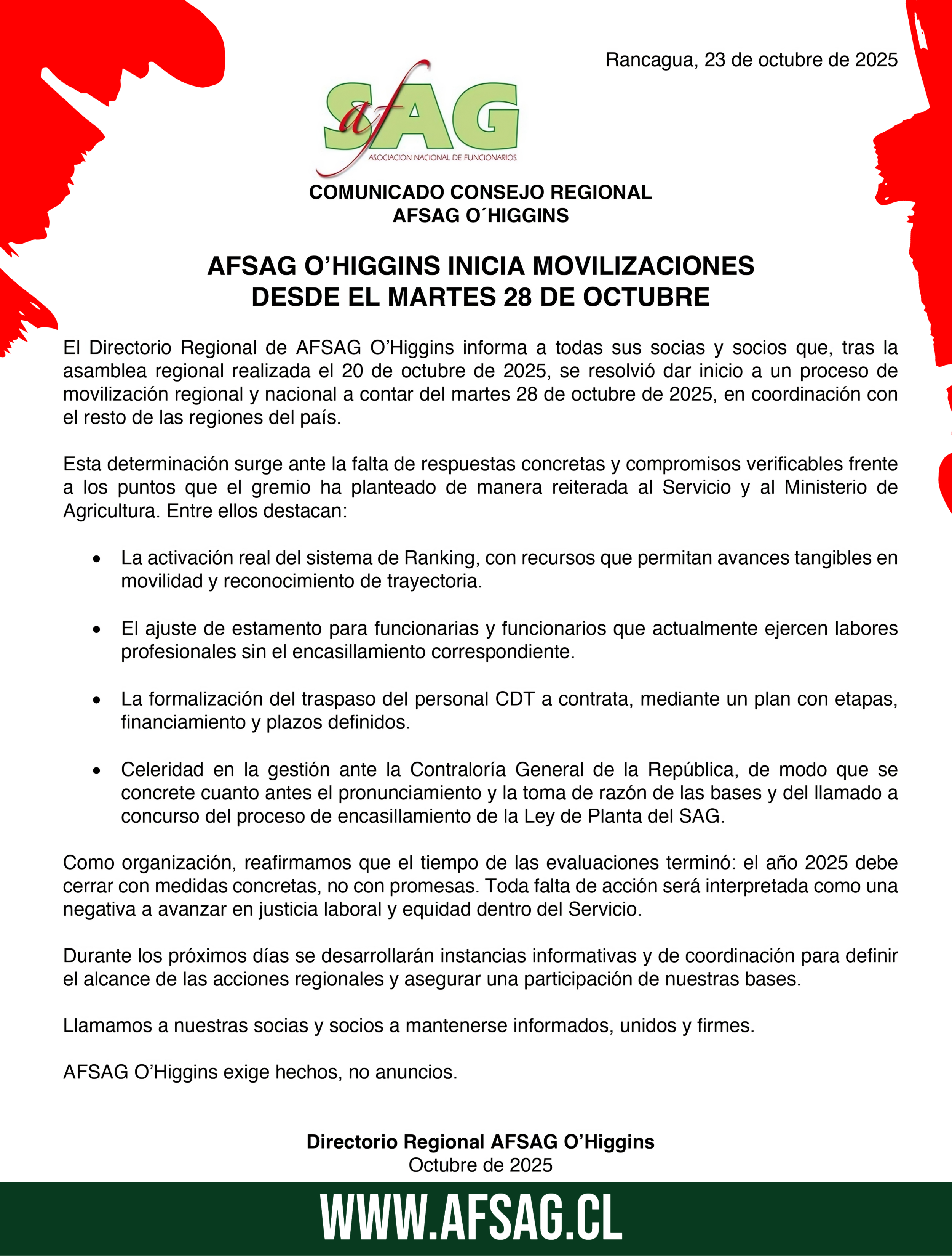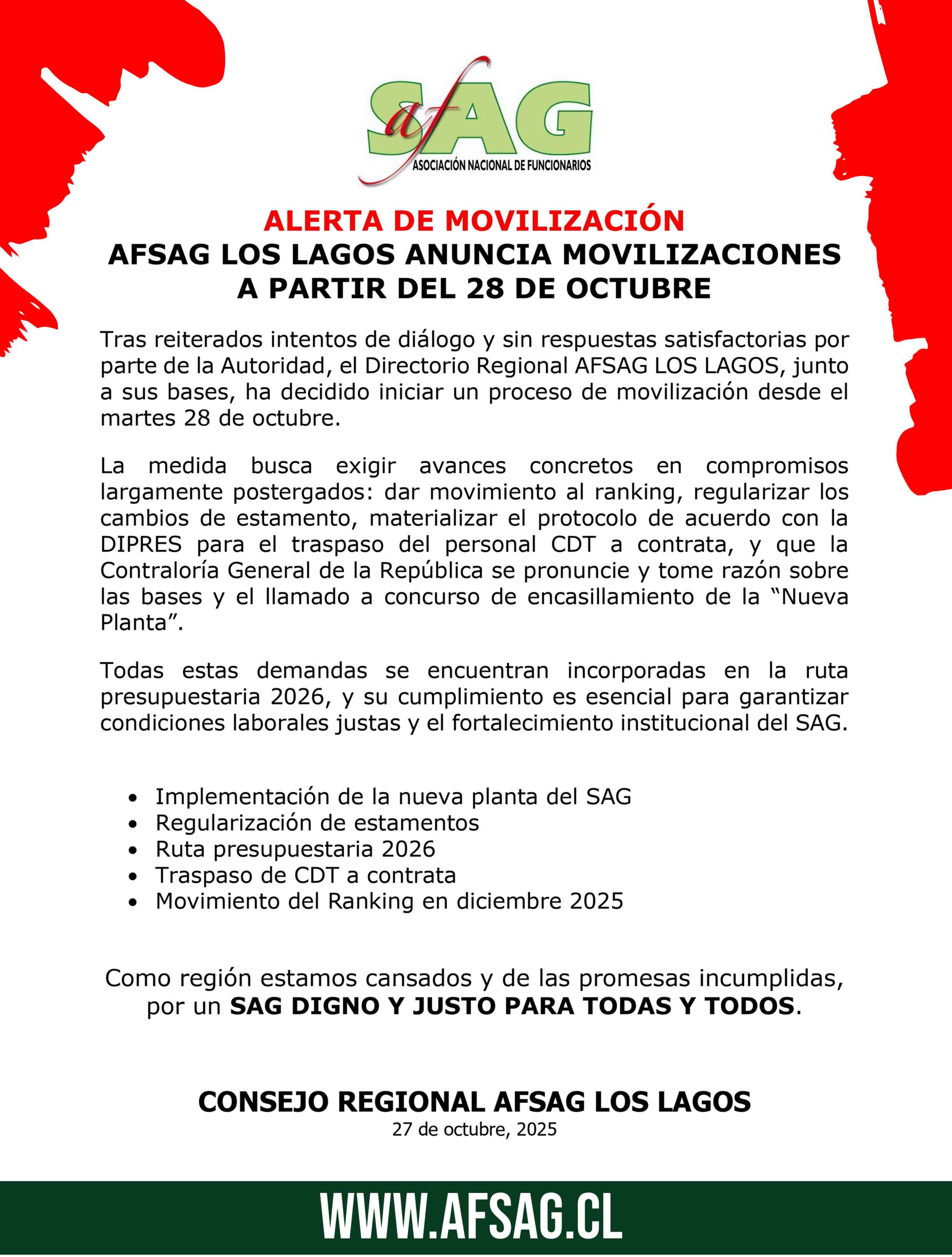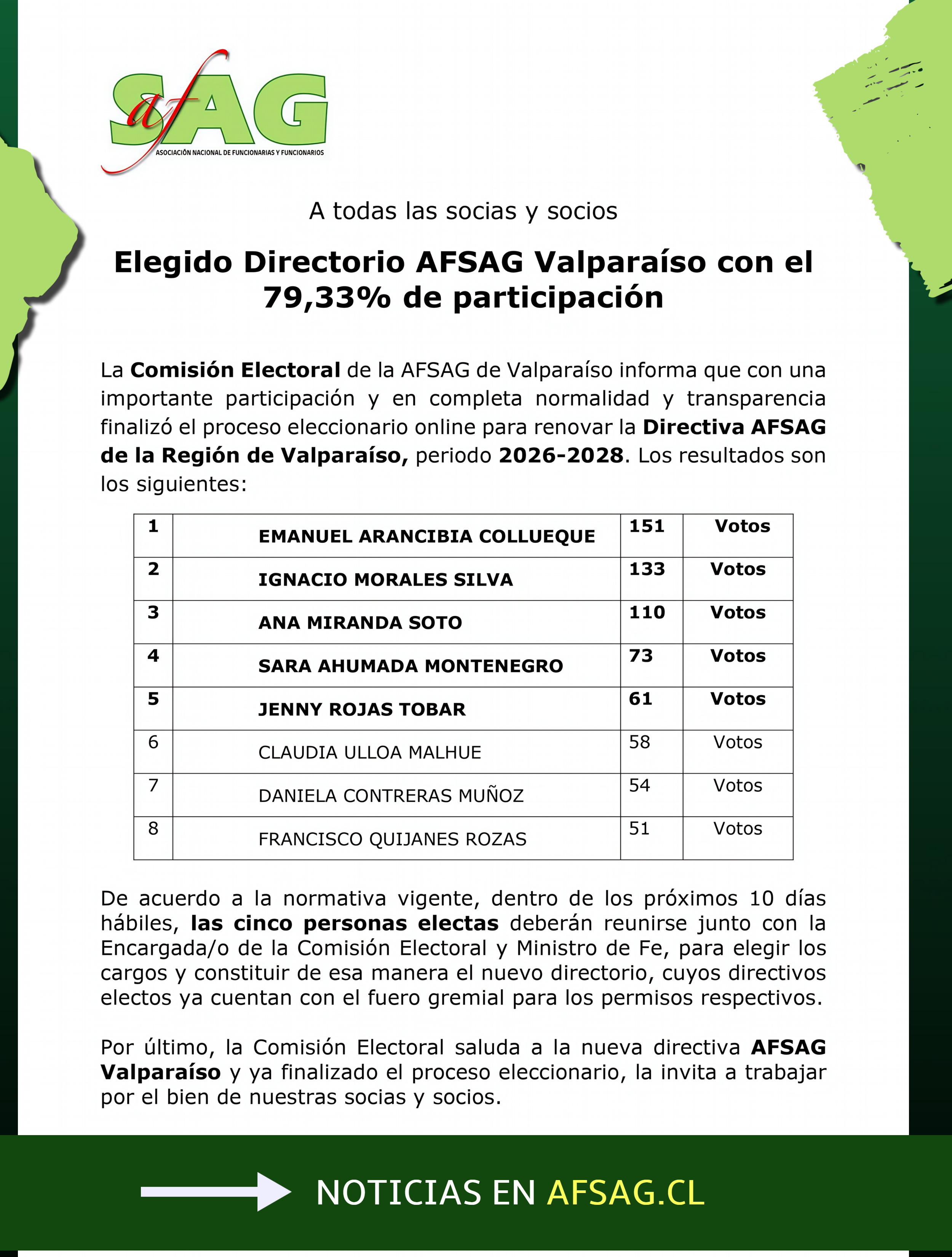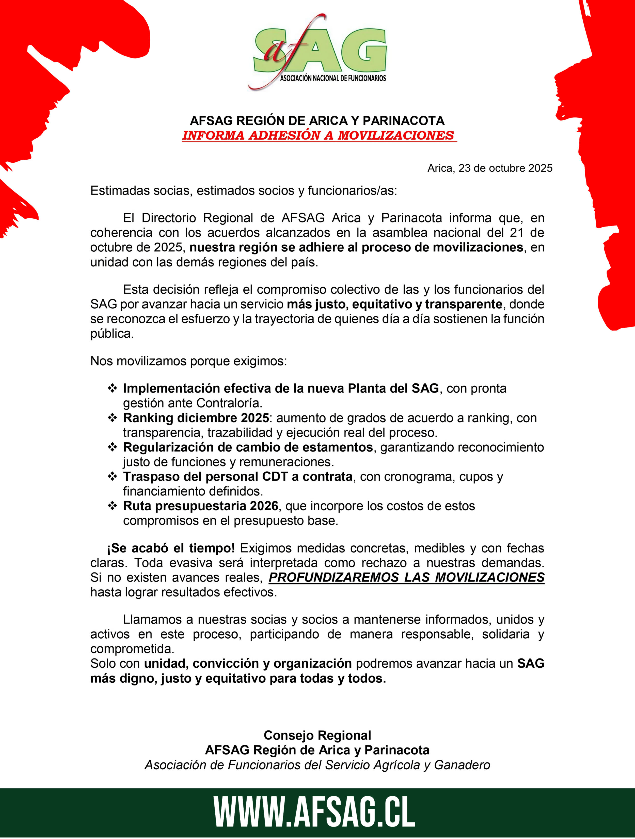 Asociación Nacional de Funcionarias y Funcionarios del Servicio Agrícola y GanaderoFONOS OFICINA AFSAG: 2 64 65 15 70 2 64 65 15 71 2 64 65 15 73 ----- afsag@afsag.cl PASEO BULNES 120 OFICINA 81 - Santiago, Chile