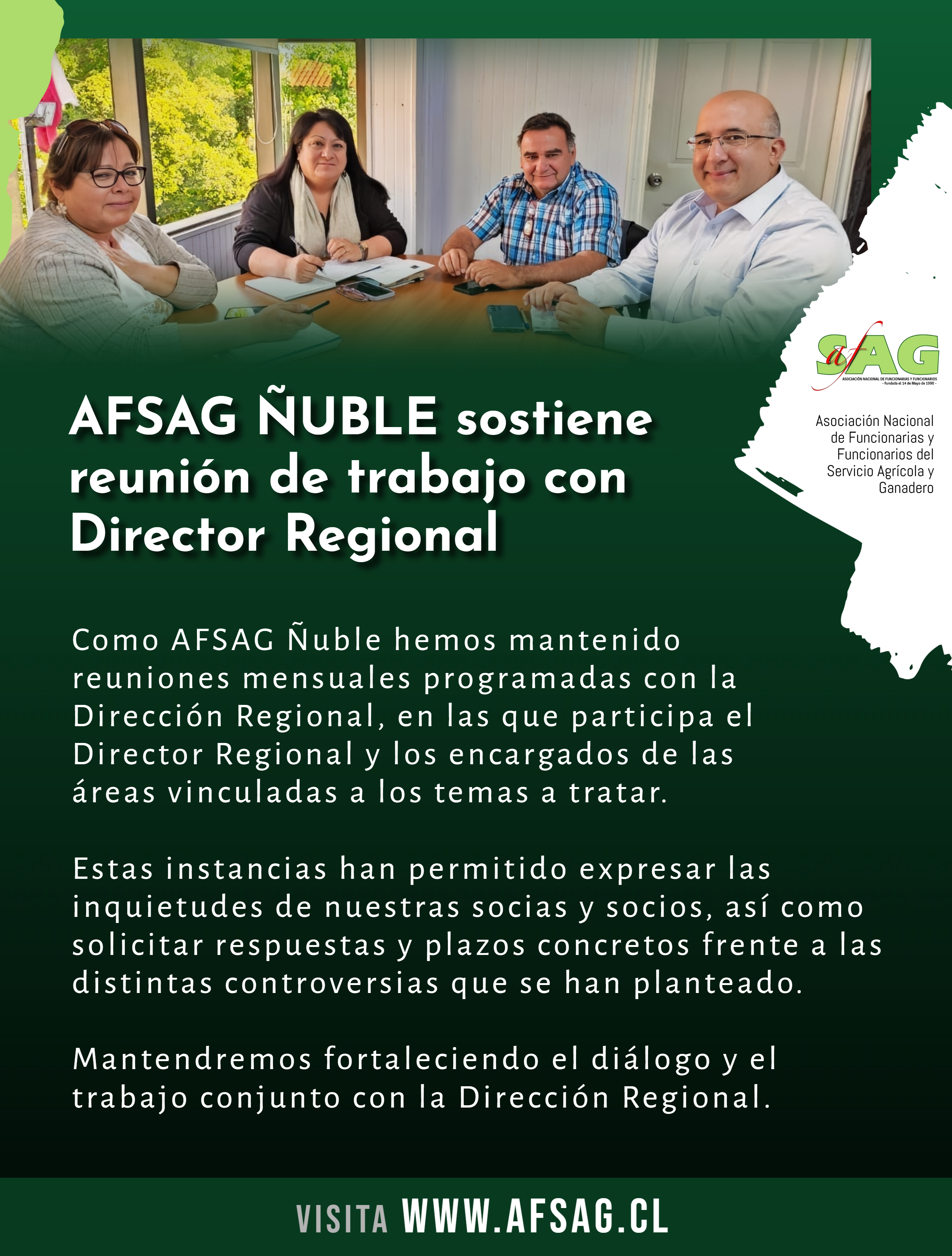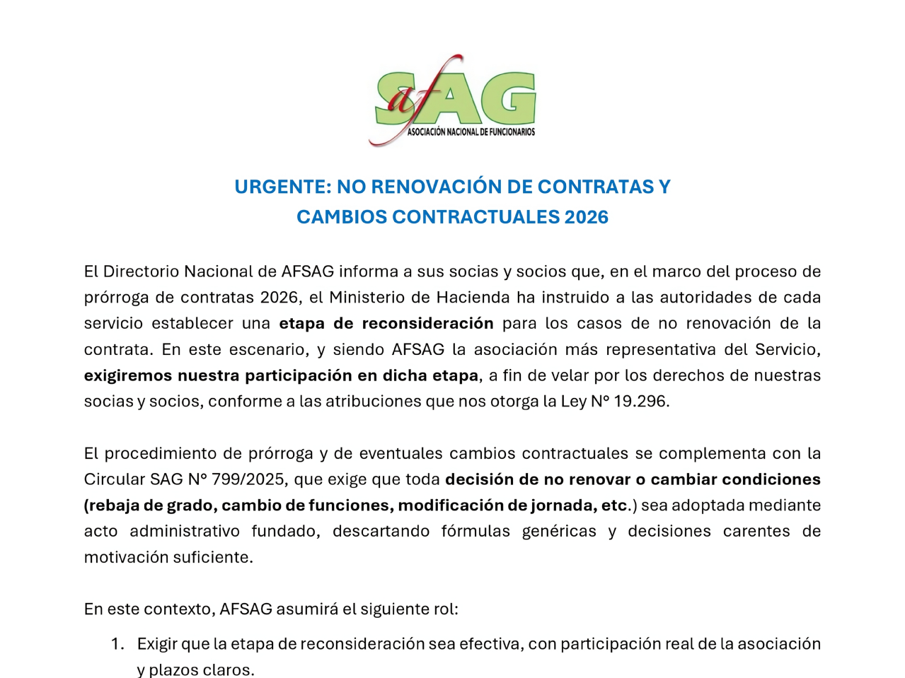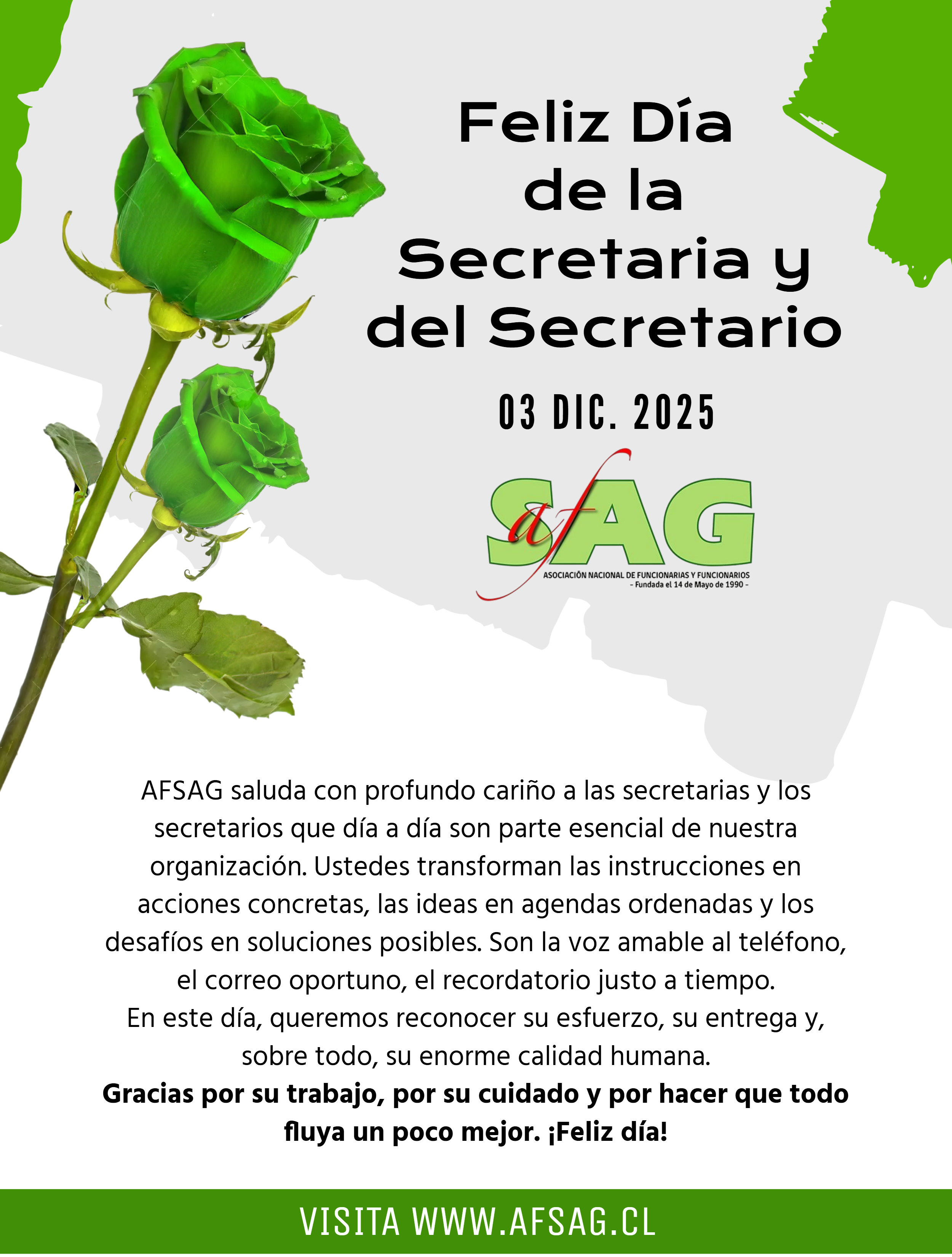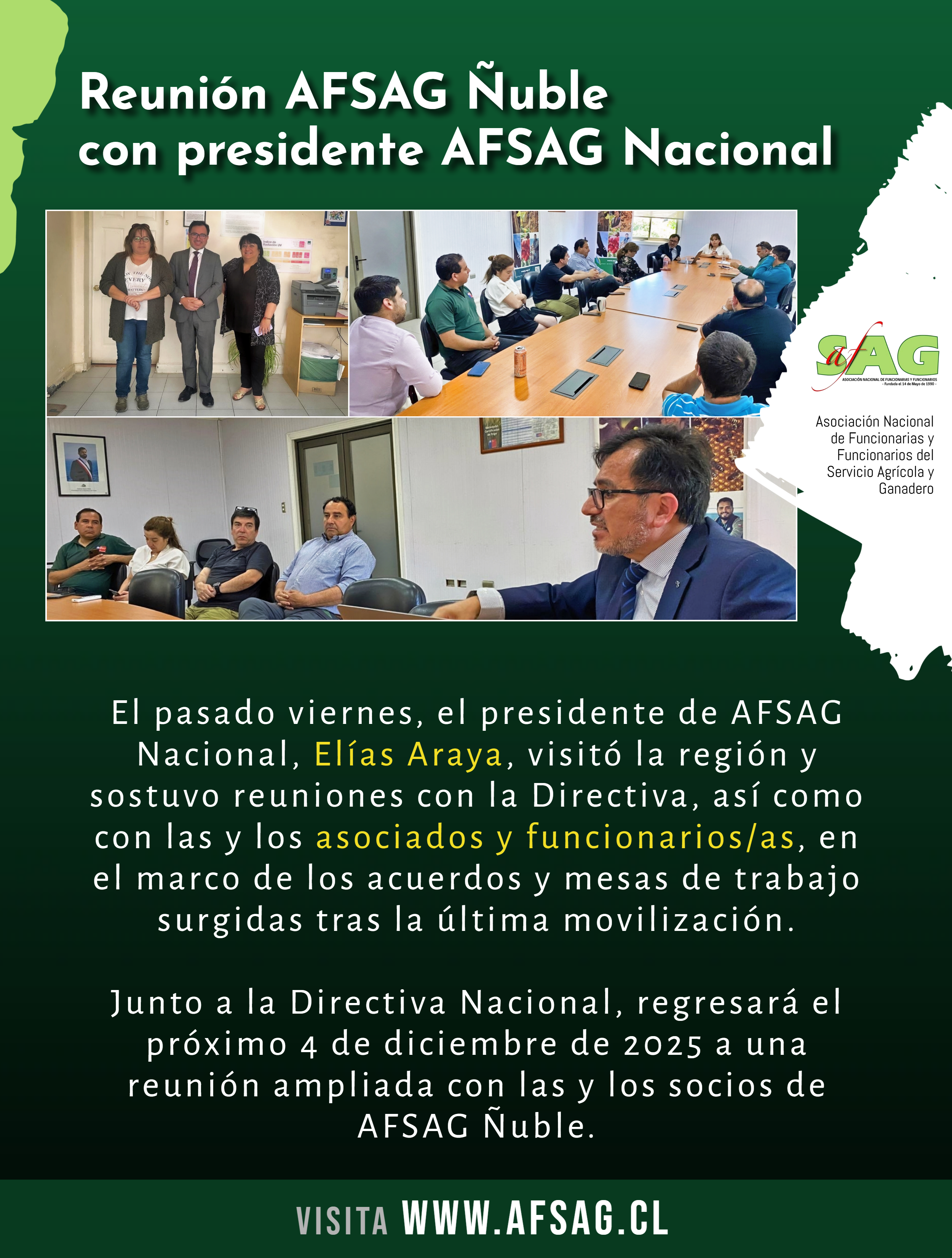 Asociación Nacional de Funcionarias y Funcionarios del Servicio Agrícola y GanaderoFONOS OFICINA AFSAG: 2 64 65 15 70 2 64 65 15 71 2 64 65 15 73 ----- afsag@afsag.cl PASEO BULNES 120 OFICINA 81 - Santiago, Chile