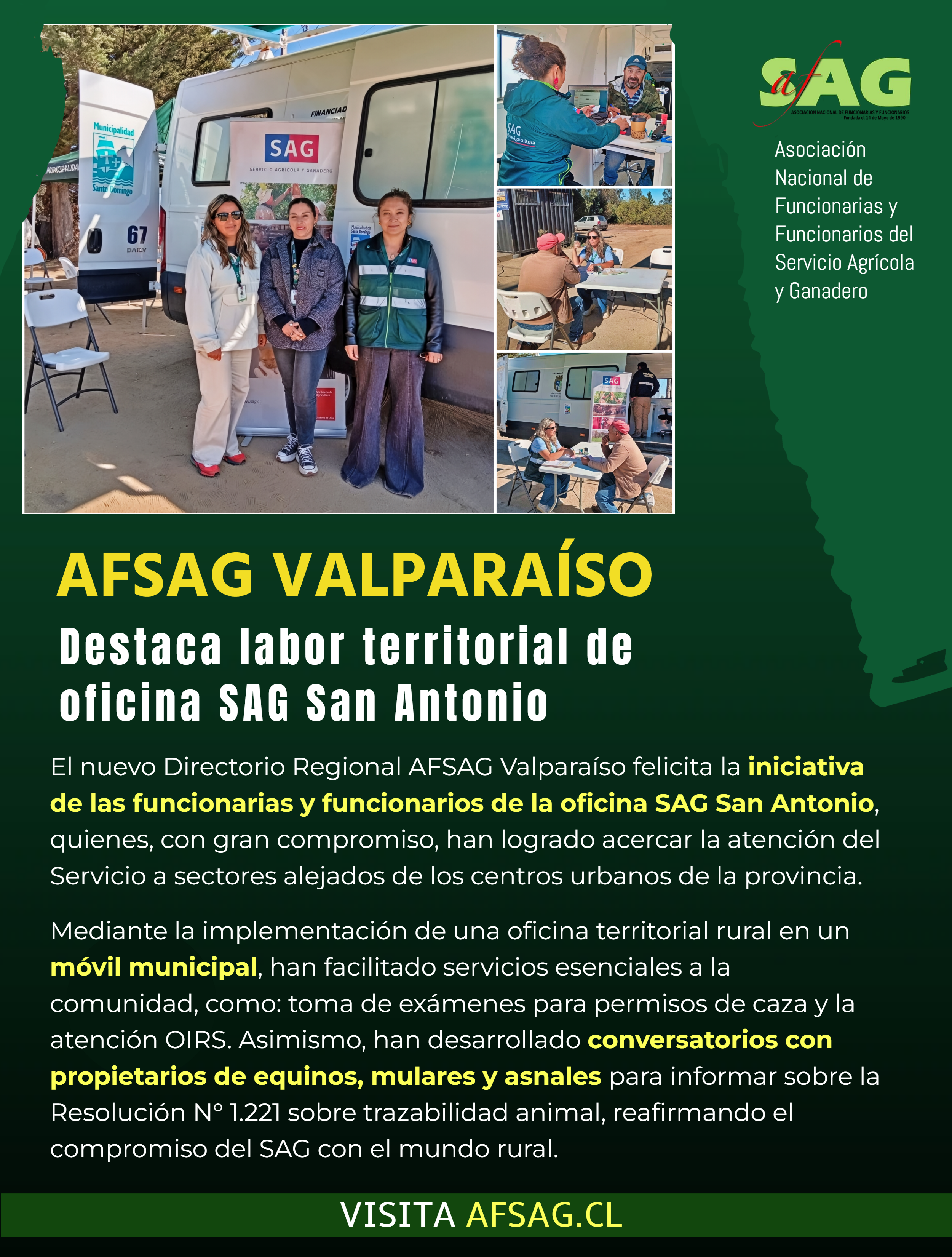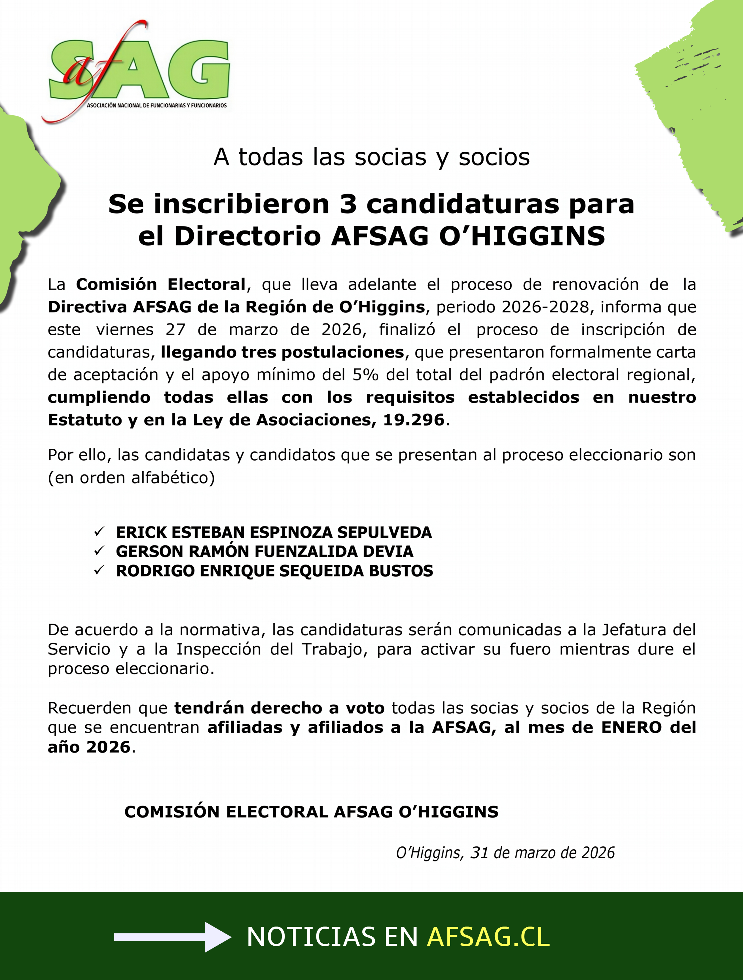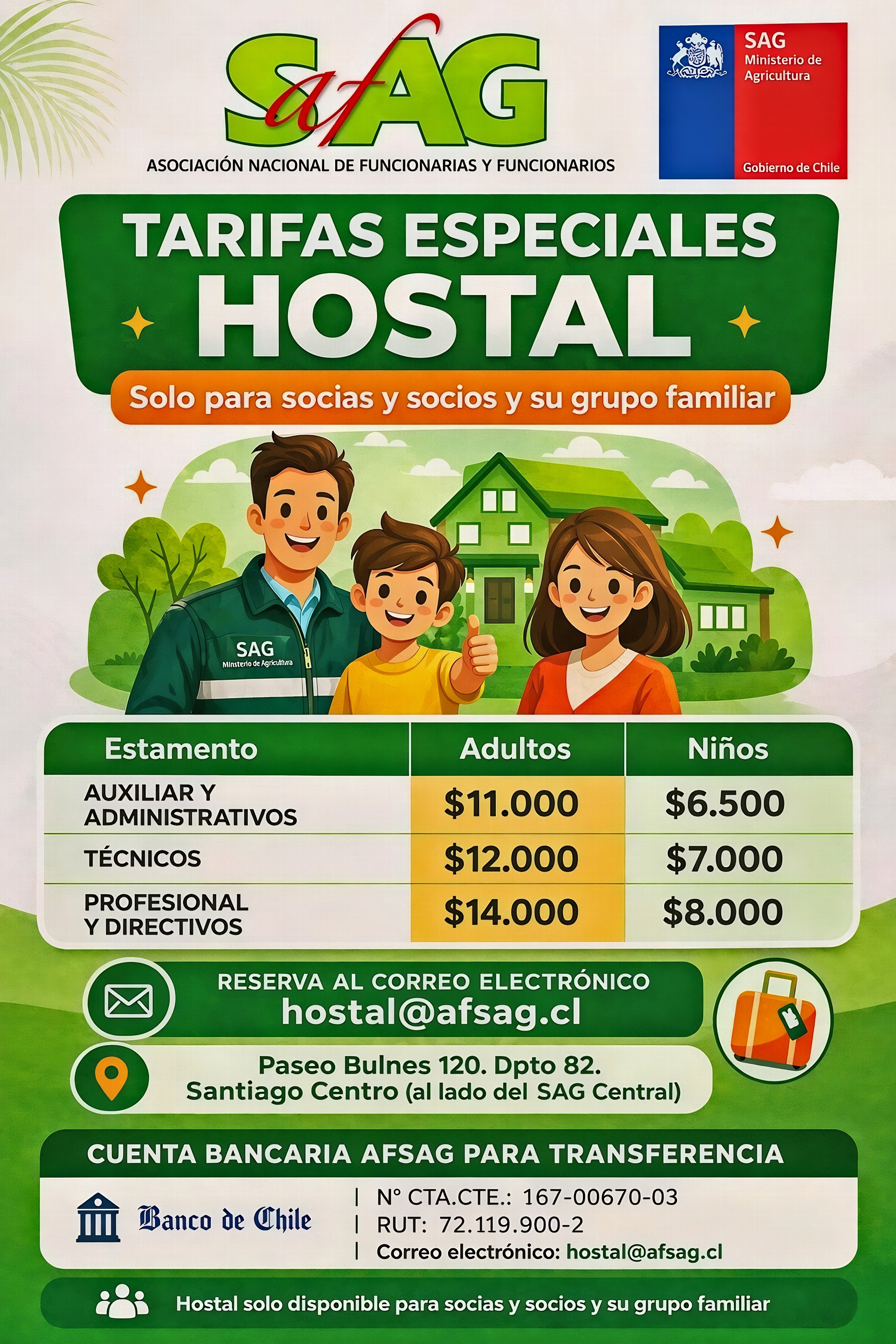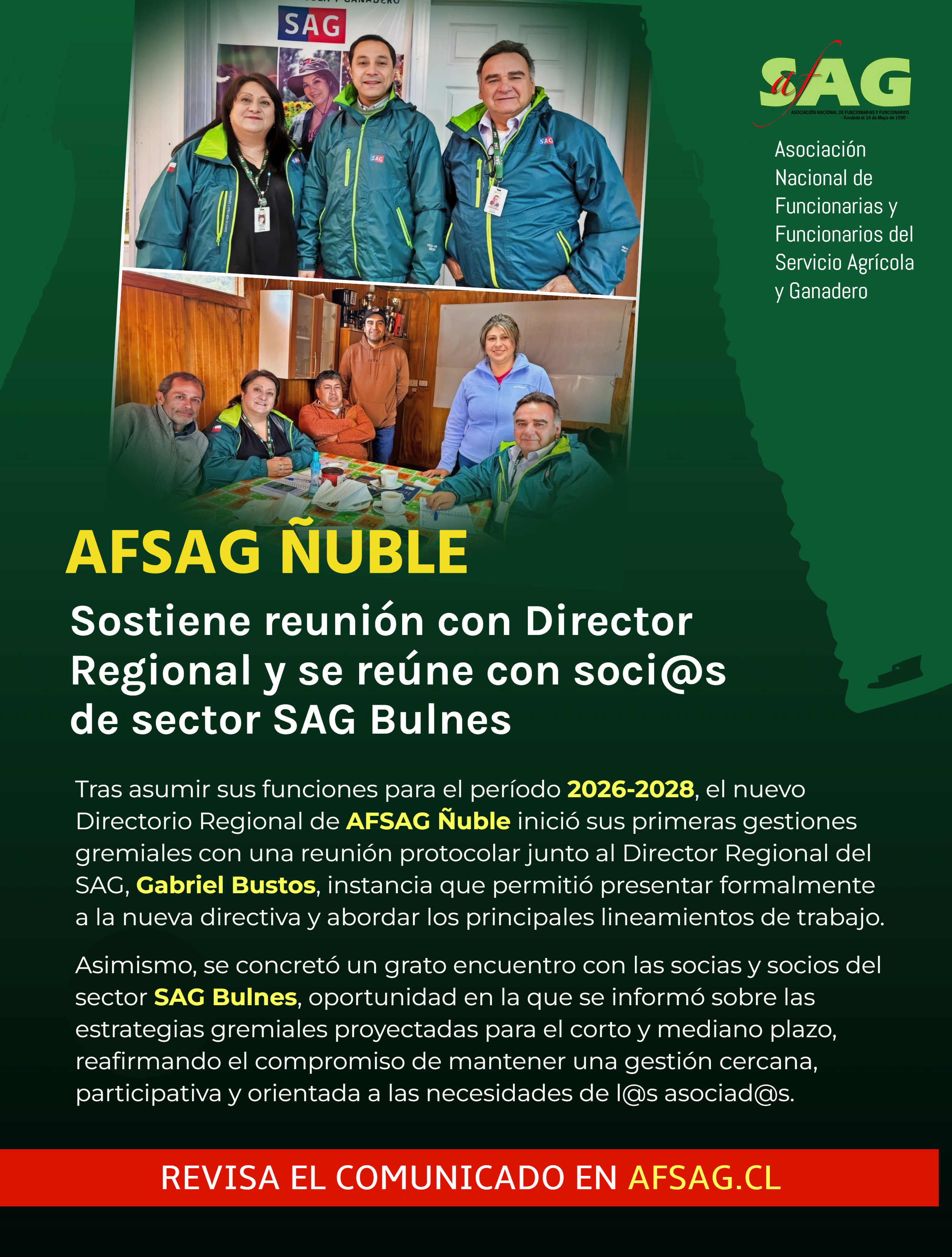 Asociación Nacional de Funcionarias y Funcionarios del Servicio Agrícola y GanaderoFONOS OFICINA AFSAG: 2 64 65 15 70 2 64 65 15 71 2 64 65 15 73 ----- afsag@afsag.cl PASEO BULNES 120 OFICINA 81 - Santiago, Chile