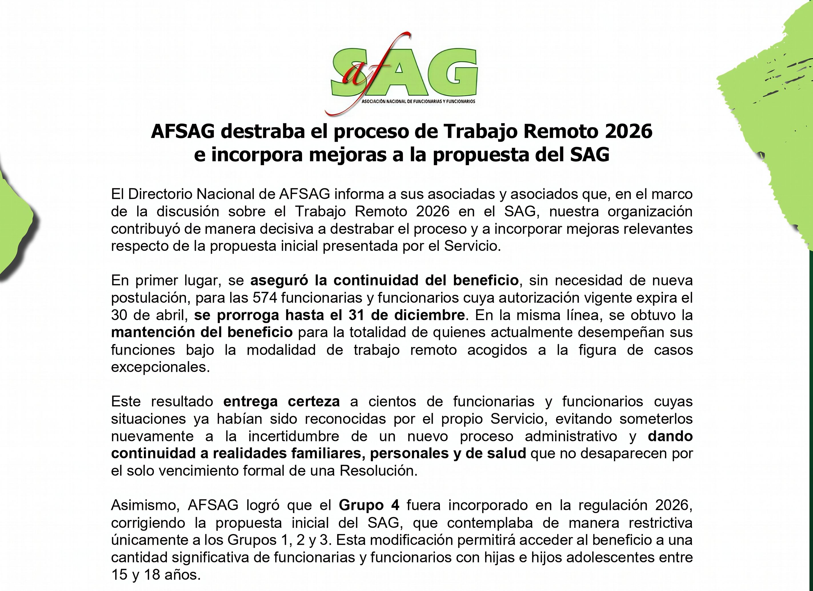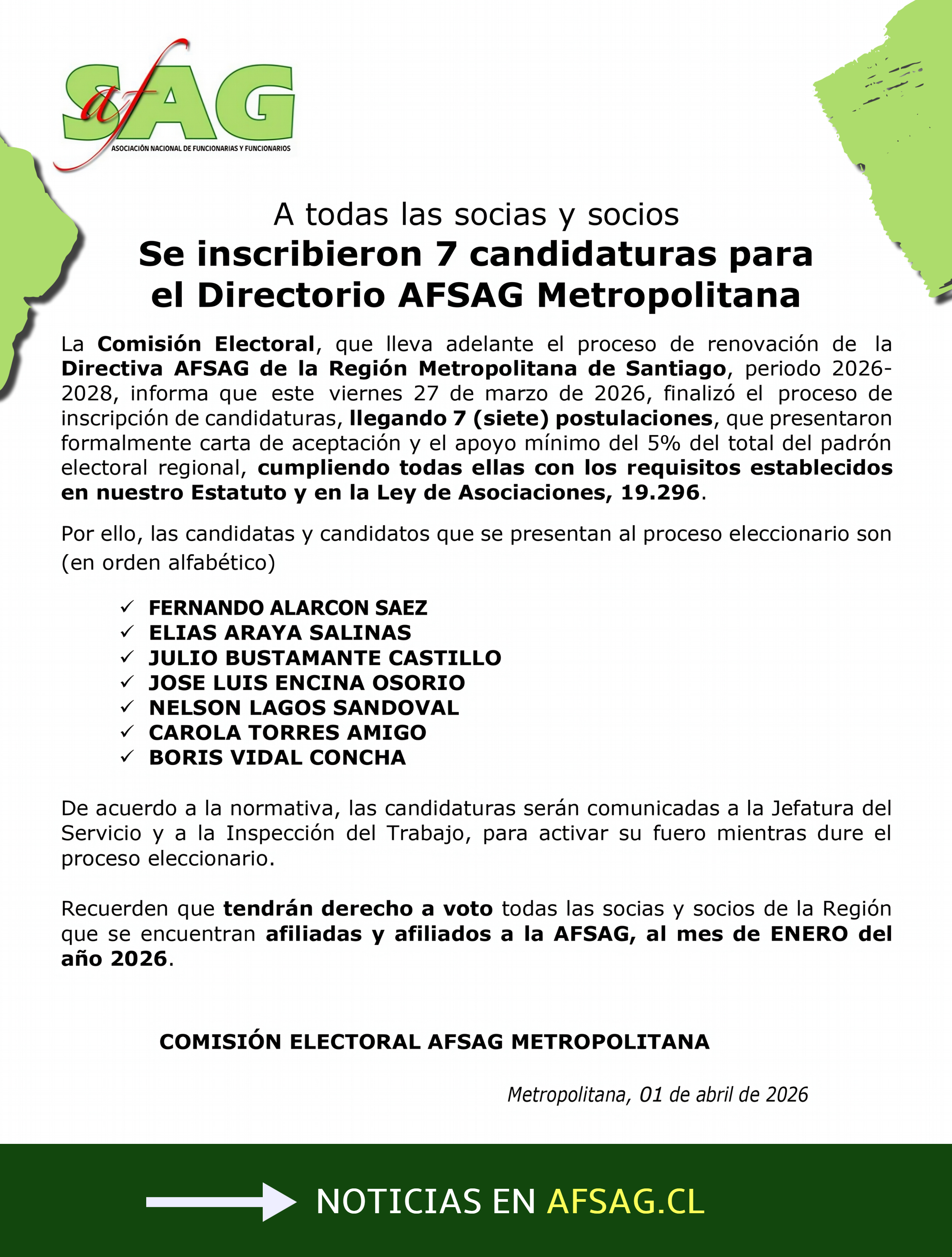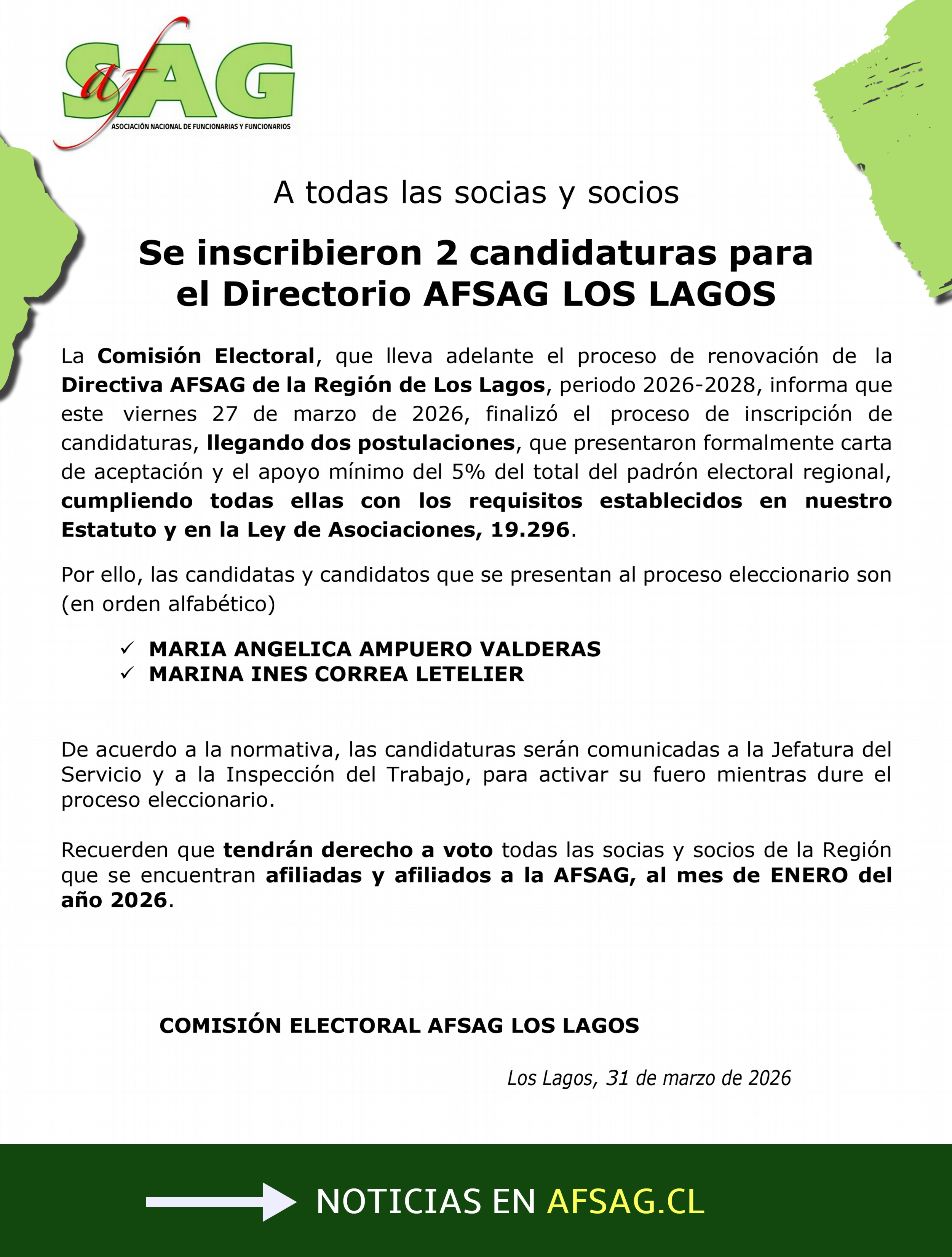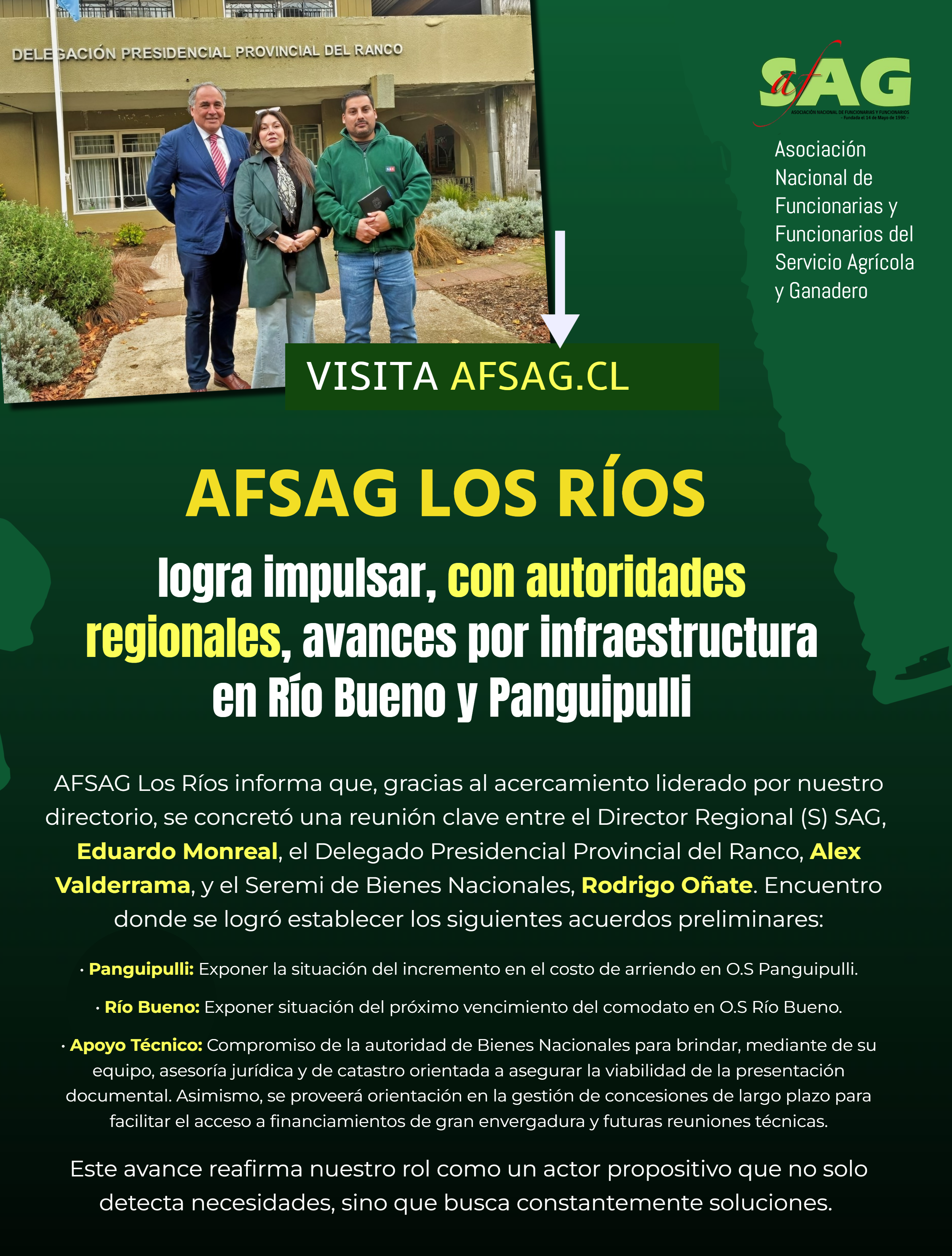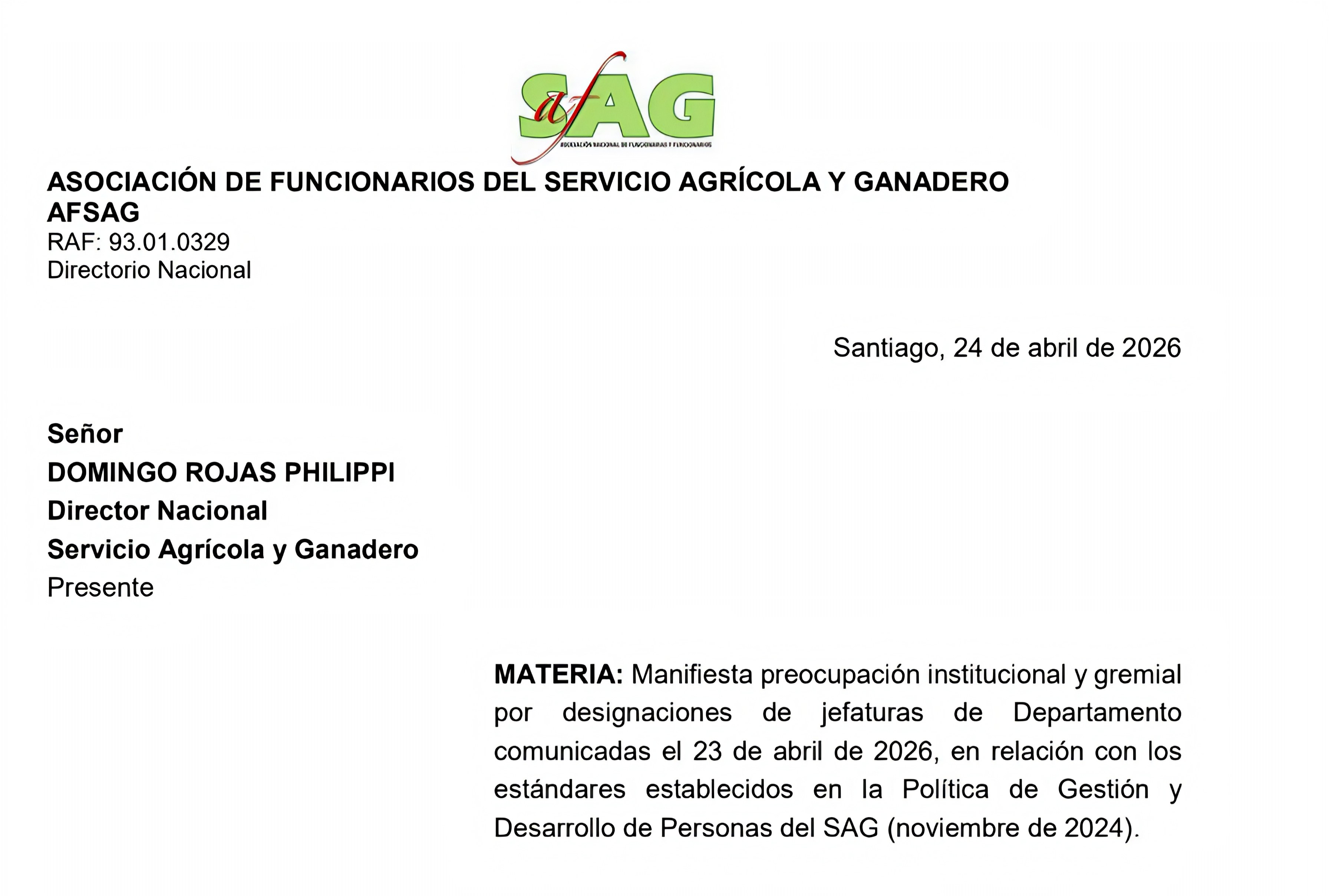 Asociación Nacional de Funcionarias y Funcionarios del Servicio Agrícola y GanaderoFONOS OFICINA AFSAG: 2 64 65 15 70 2 64 65 15 71 2 64 65 15 73 ----- afsag@afsag.cl PASEO BULNES 120 OFICINA 81 - Santiago, Chile