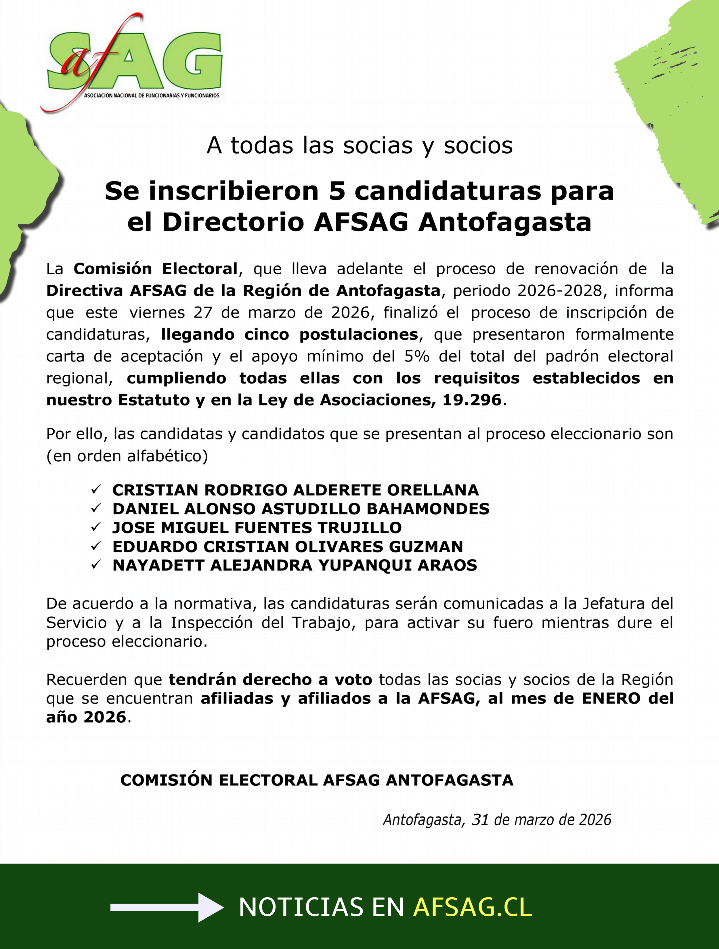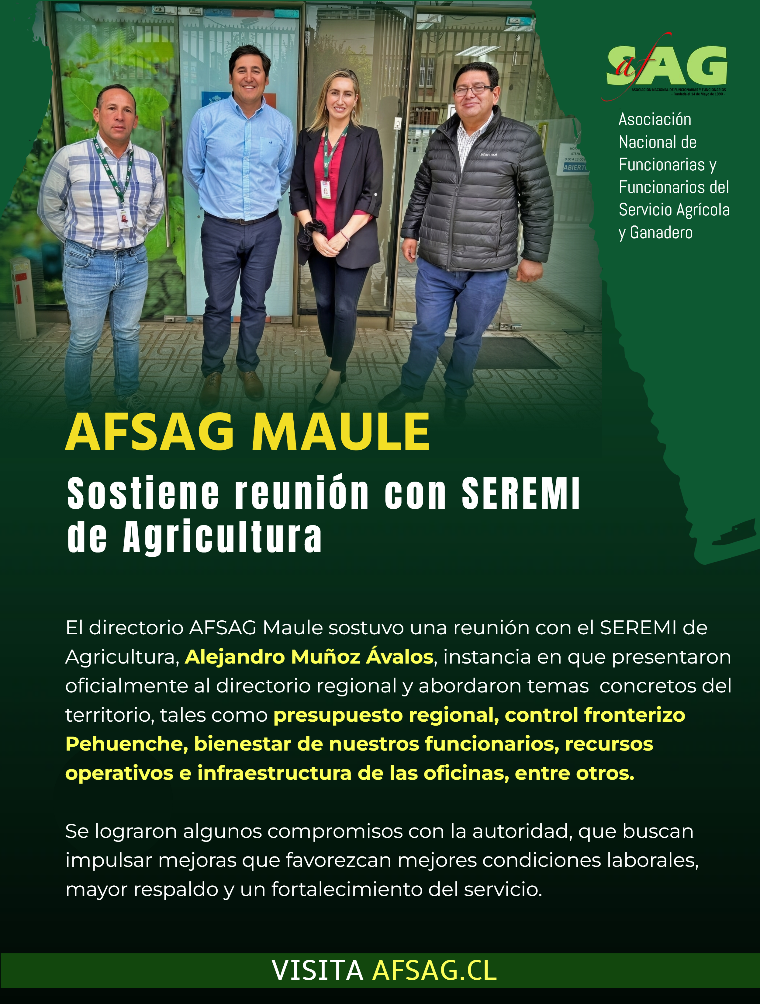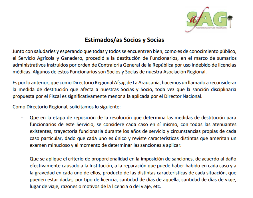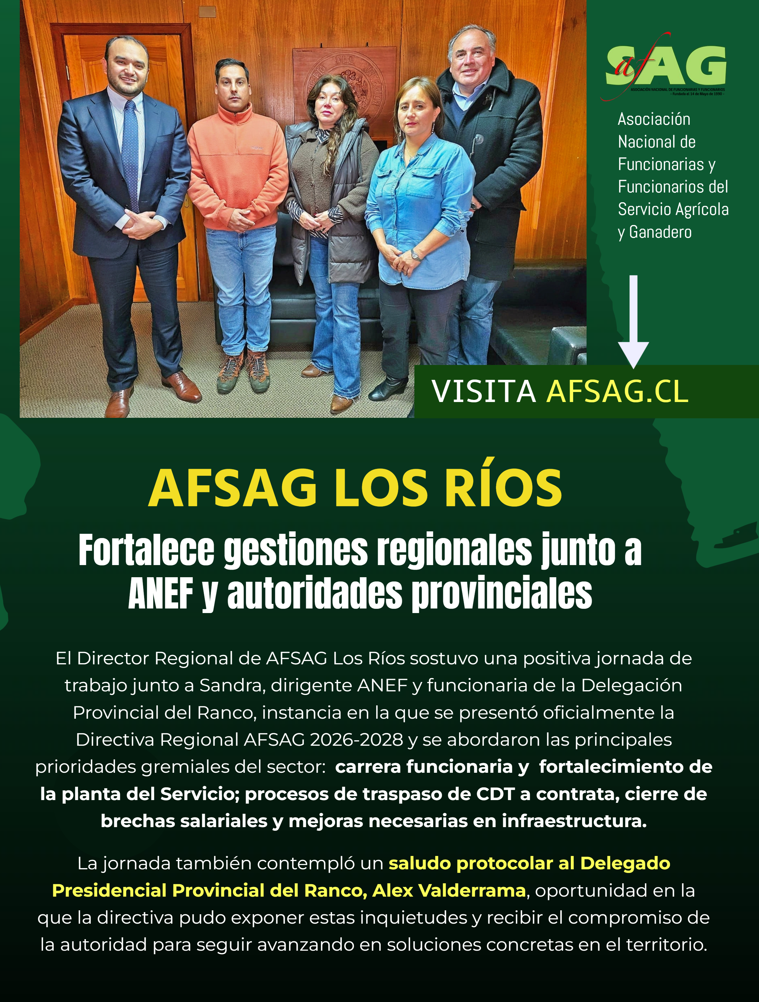 Asociación Nacional de Funcionarias y Funcionarios del Servicio Agrícola y GanaderoFONOS OFICINA AFSAG: 2 64 65 15 70 2 64 65 15 71 2 64 65 15 73 ----- afsag@afsag.cl PASEO BULNES 120 OFICINA 81 - Santiago, Chile