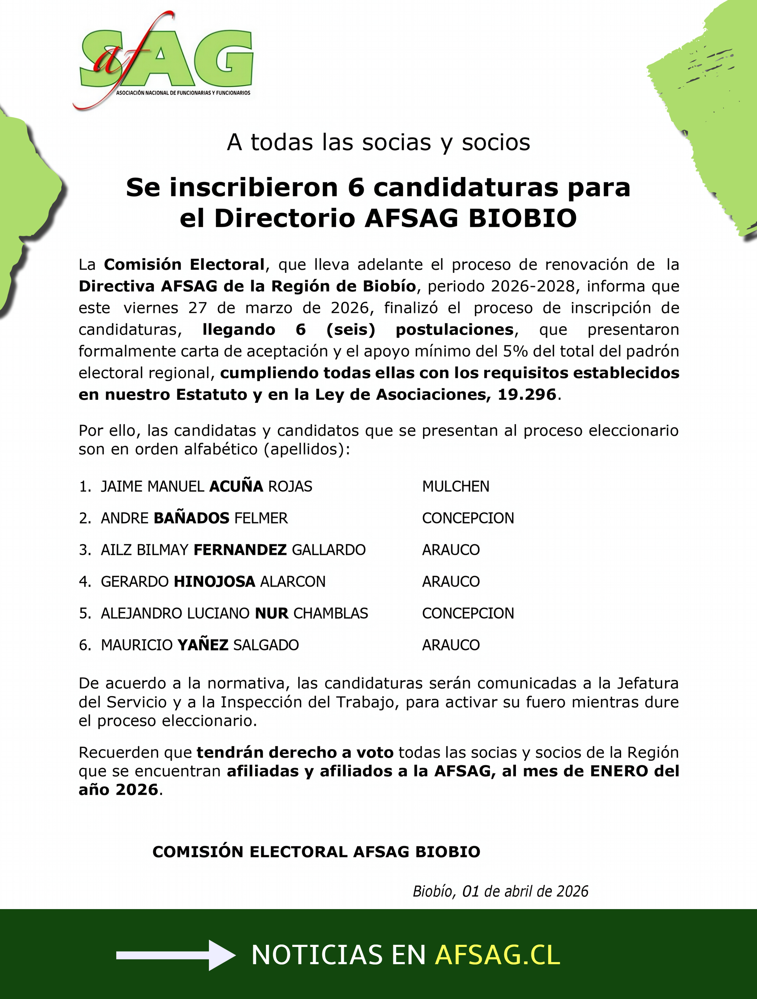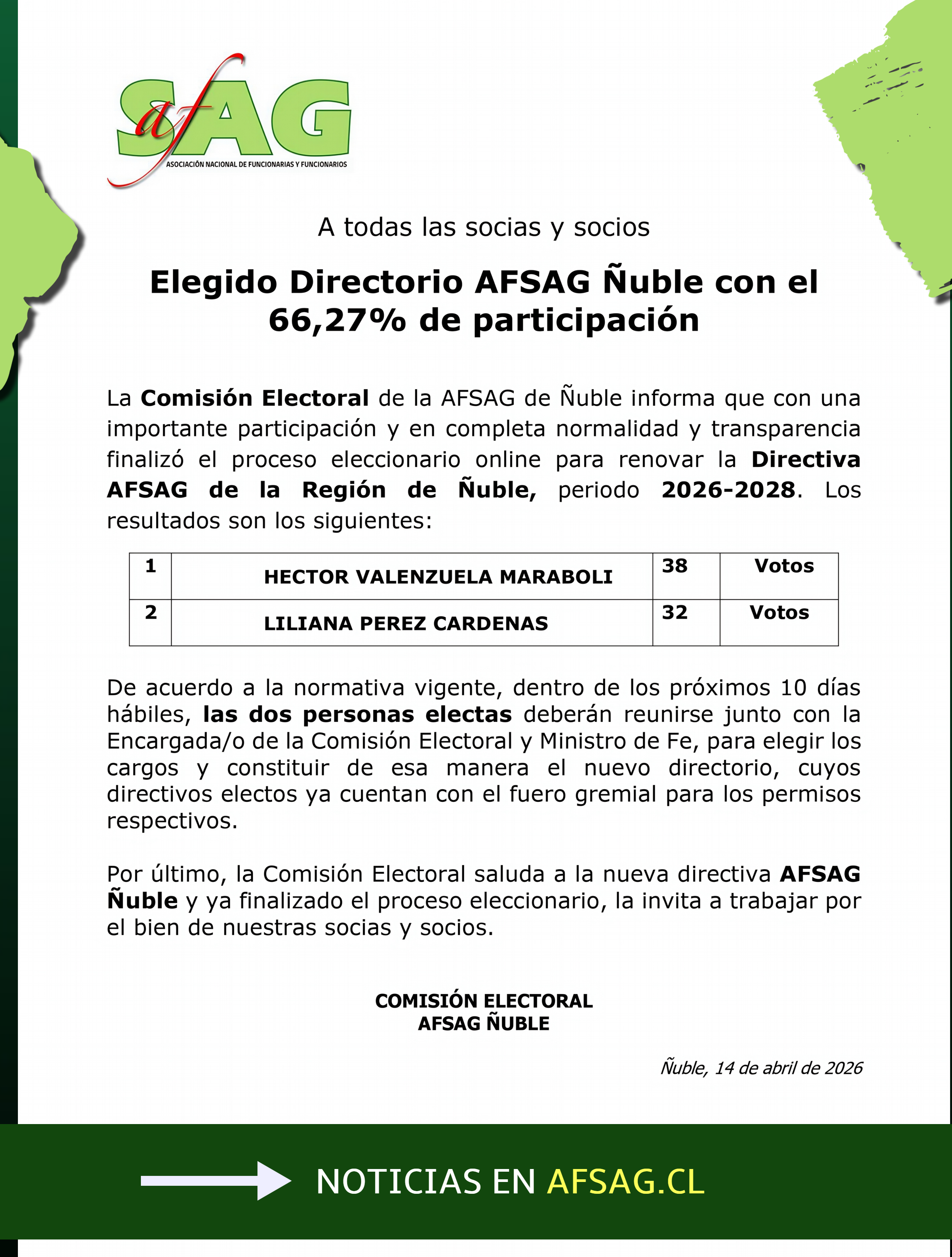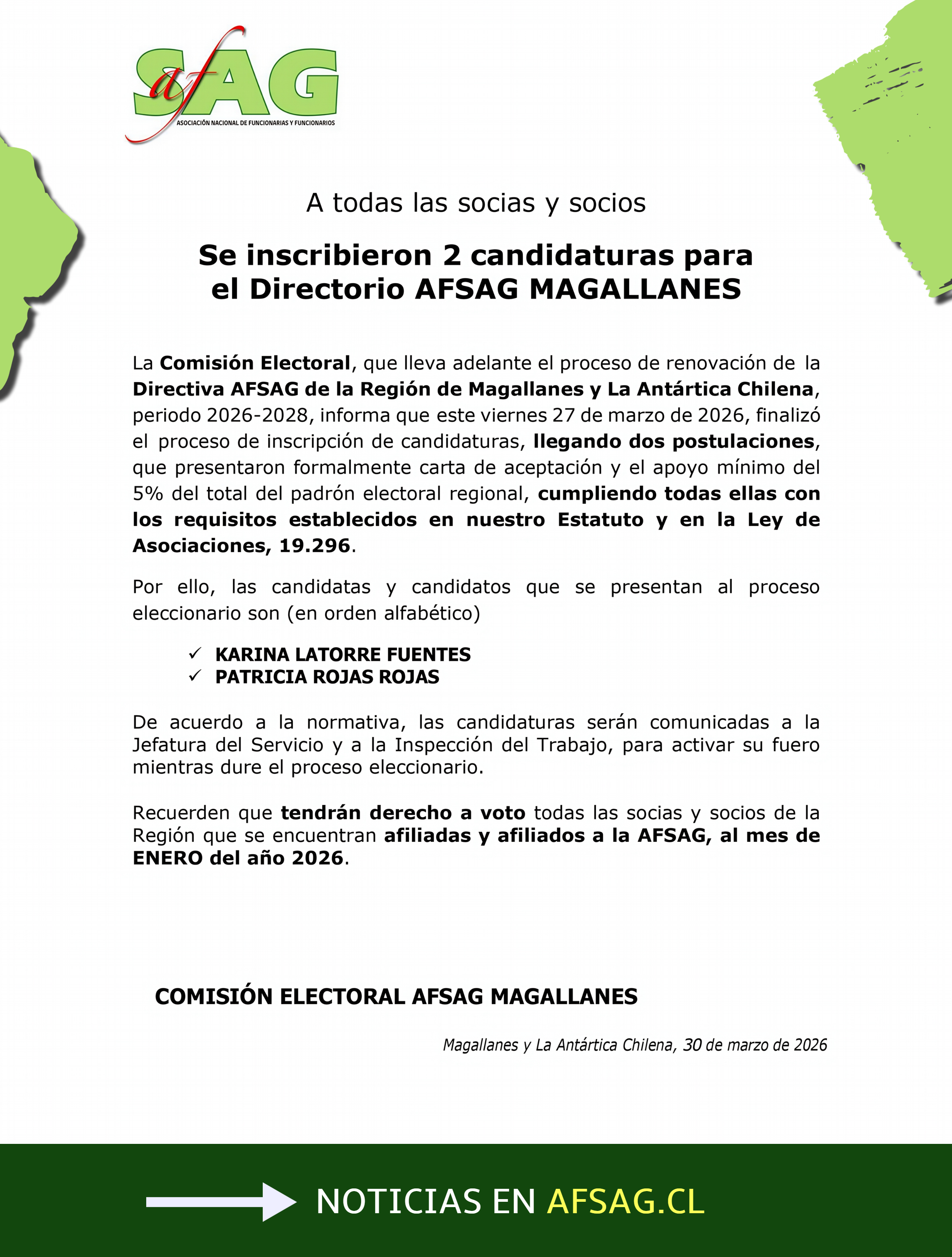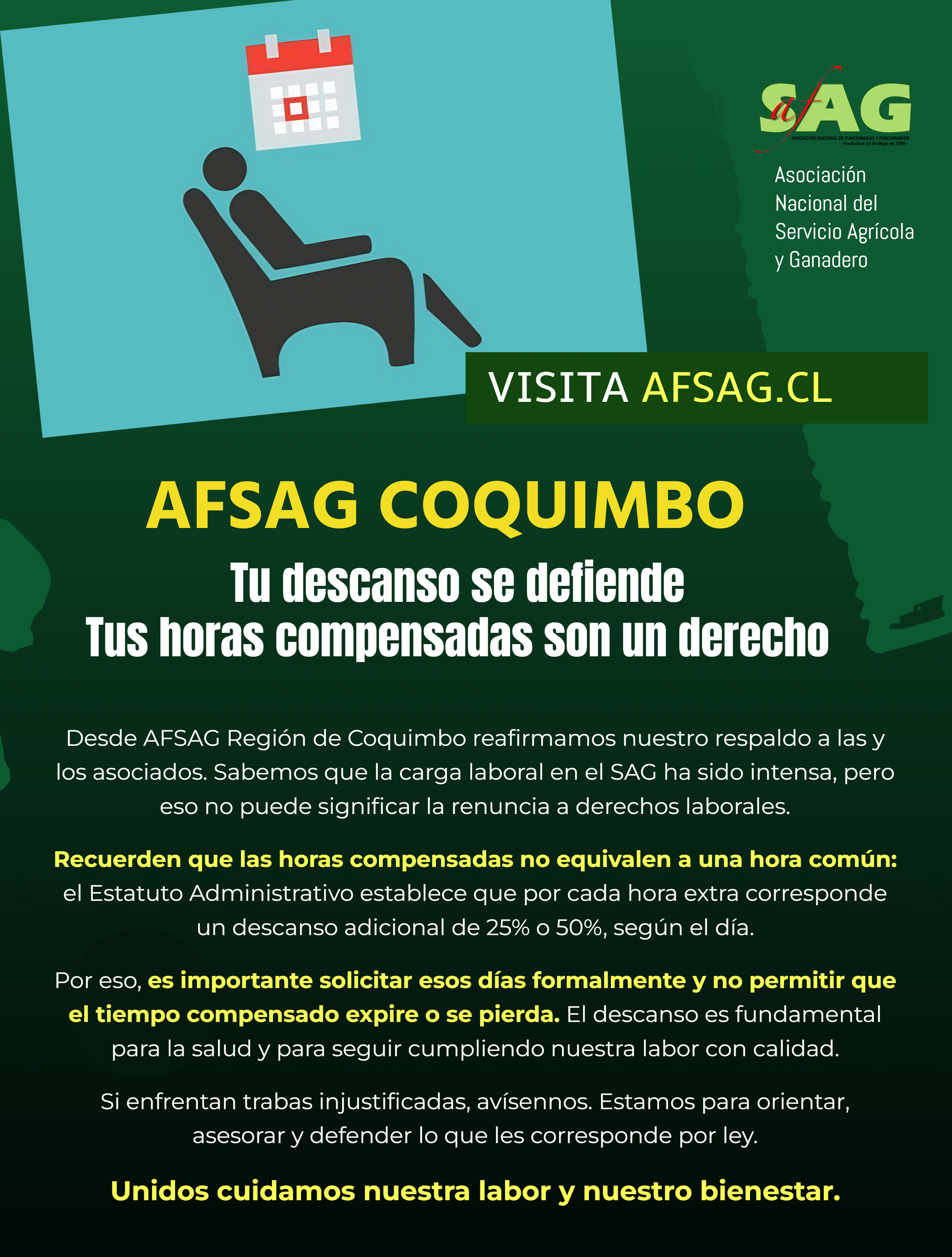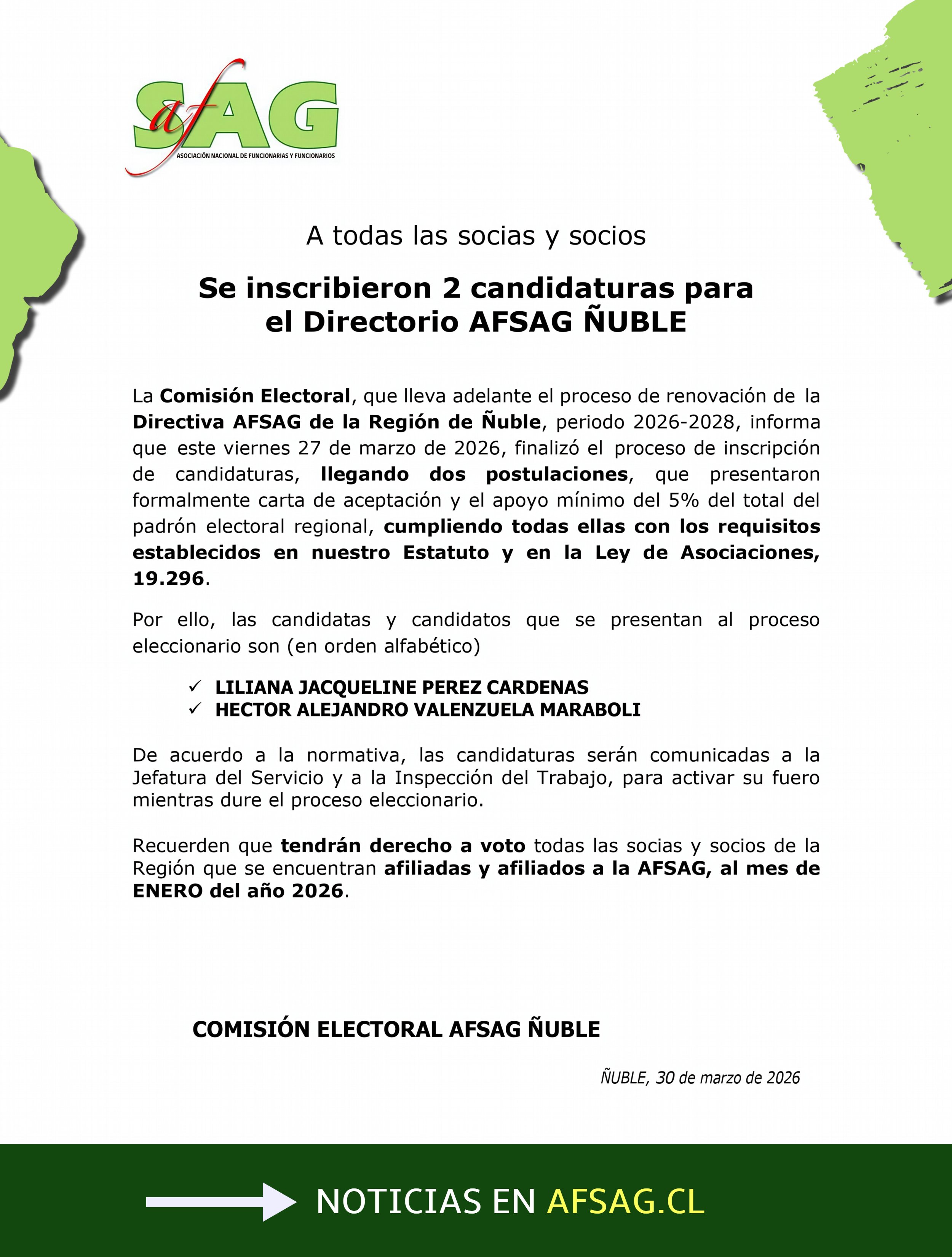 Asociación Nacional de Funcionarias y Funcionarios del Servicio Agrícola y GanaderoFONOS OFICINA AFSAG: 2 64 65 15 70 2 64 65 15 71 2 64 65 15 73 ----- afsag@afsag.cl PASEO BULNES 120 OFICINA 81 - Santiago, Chile