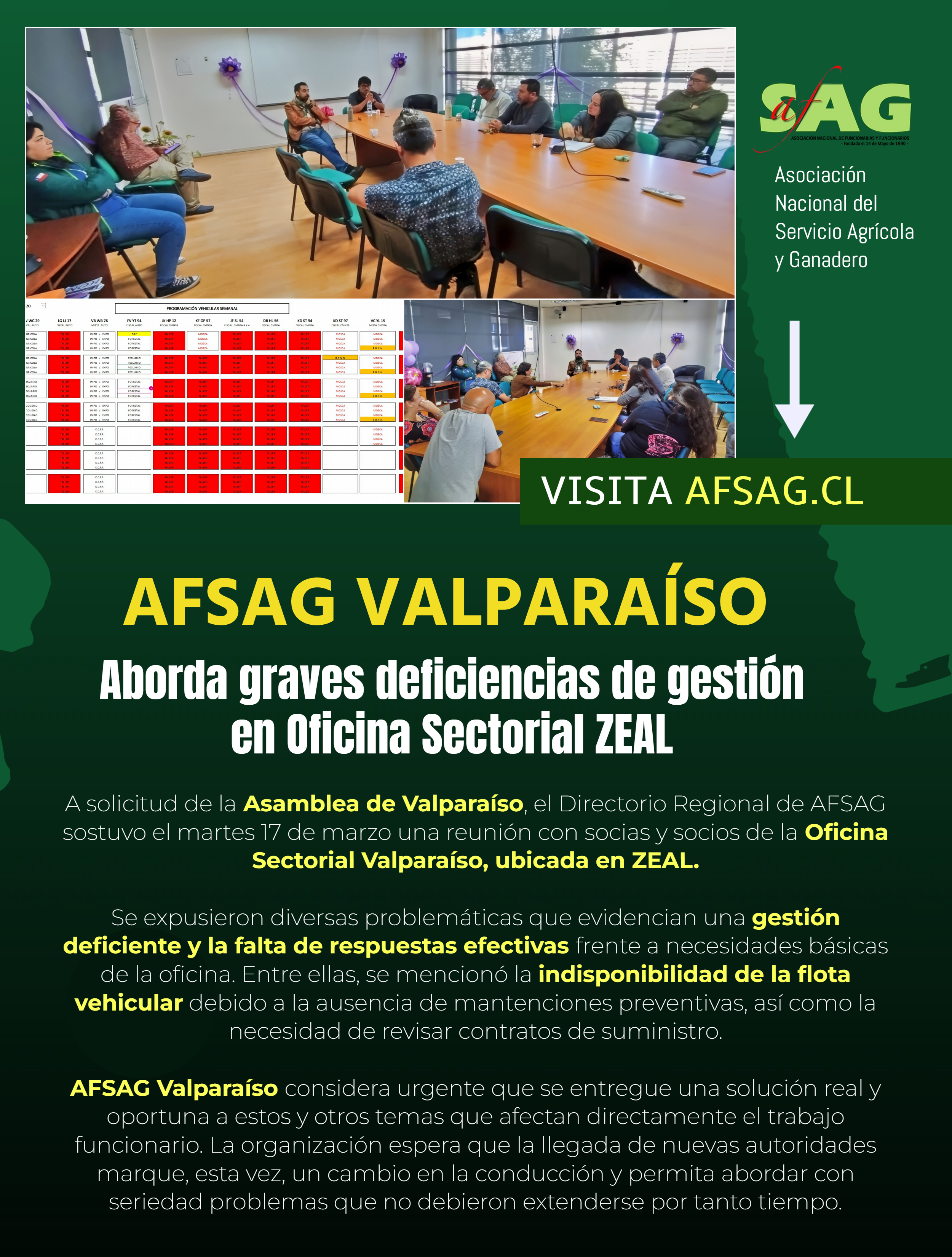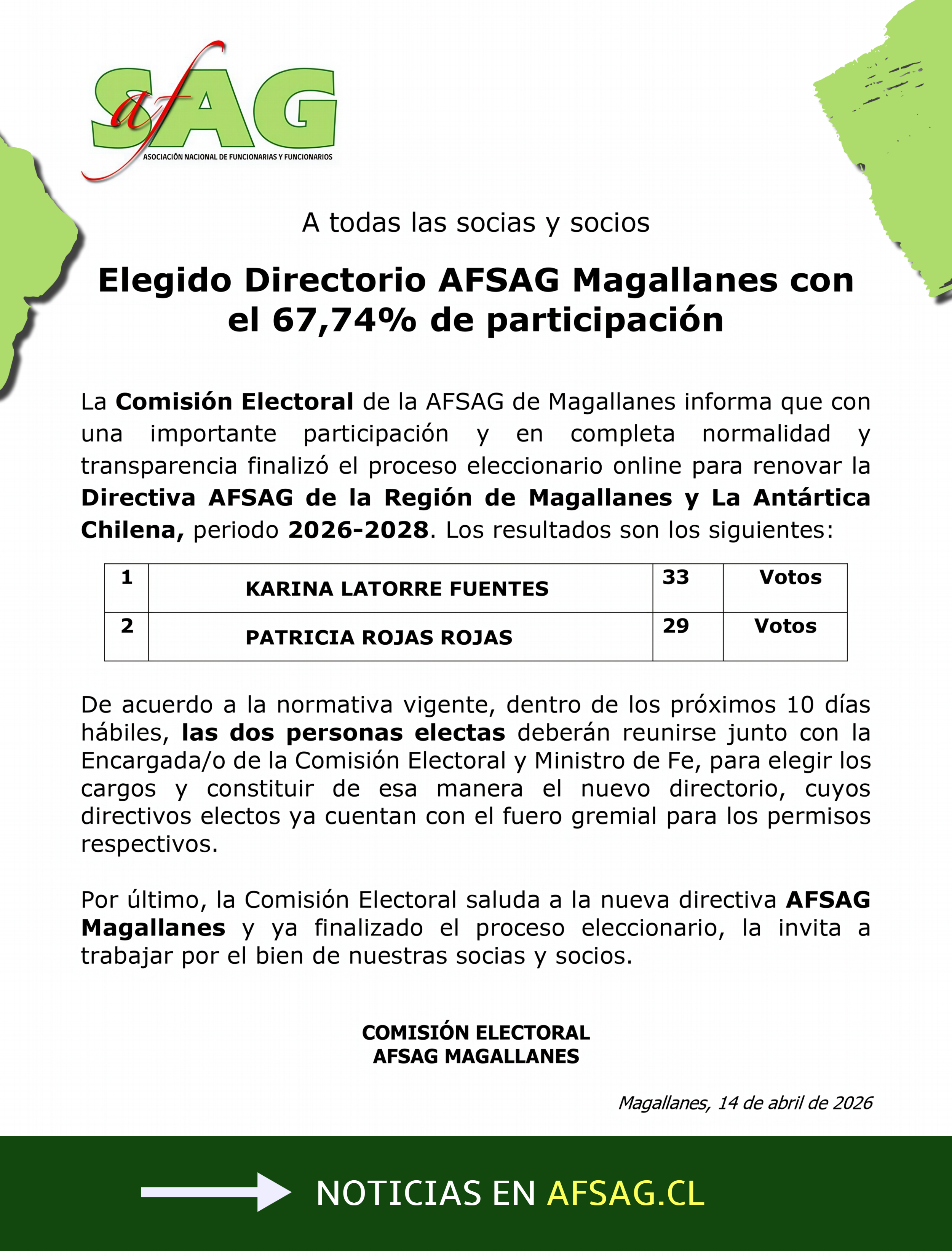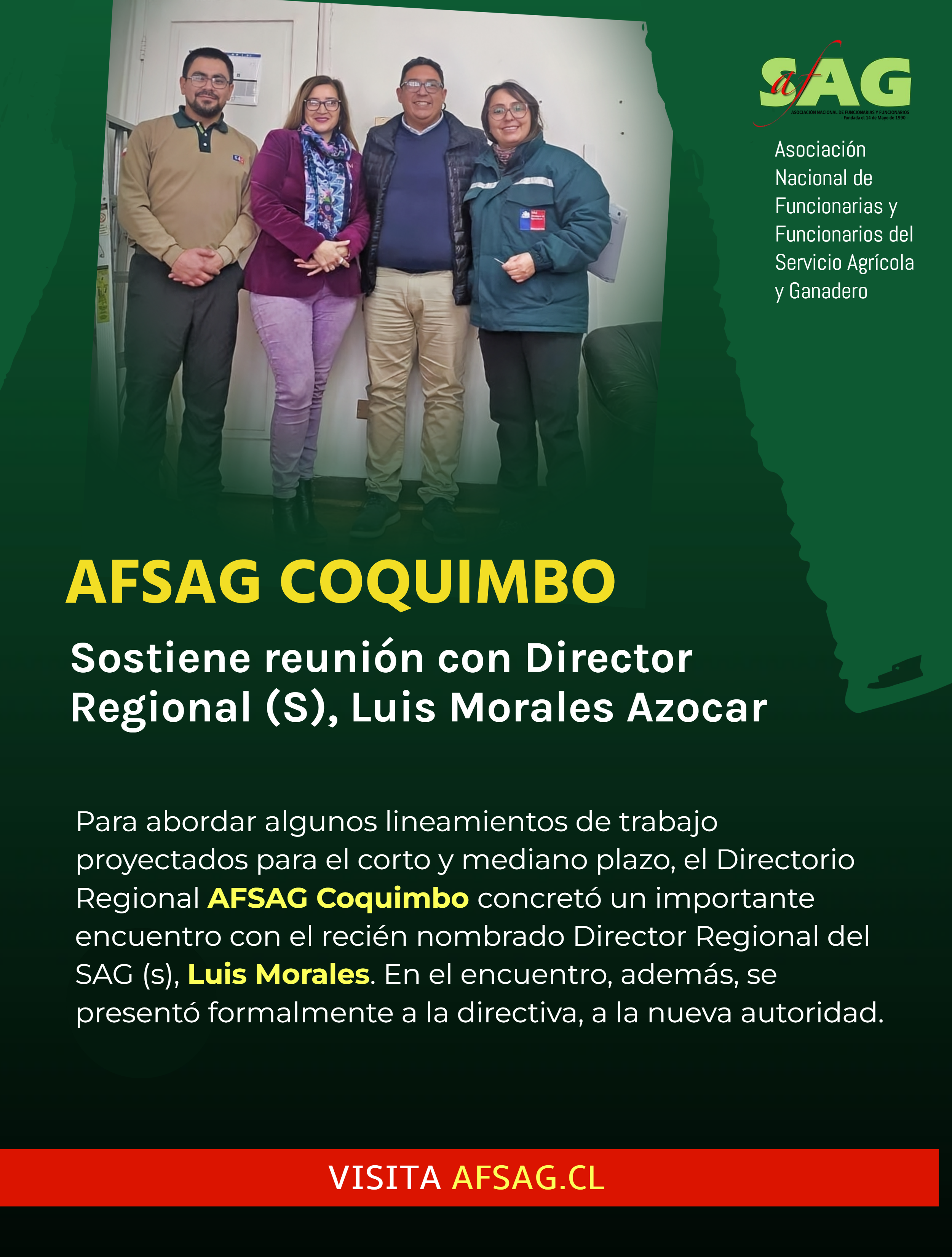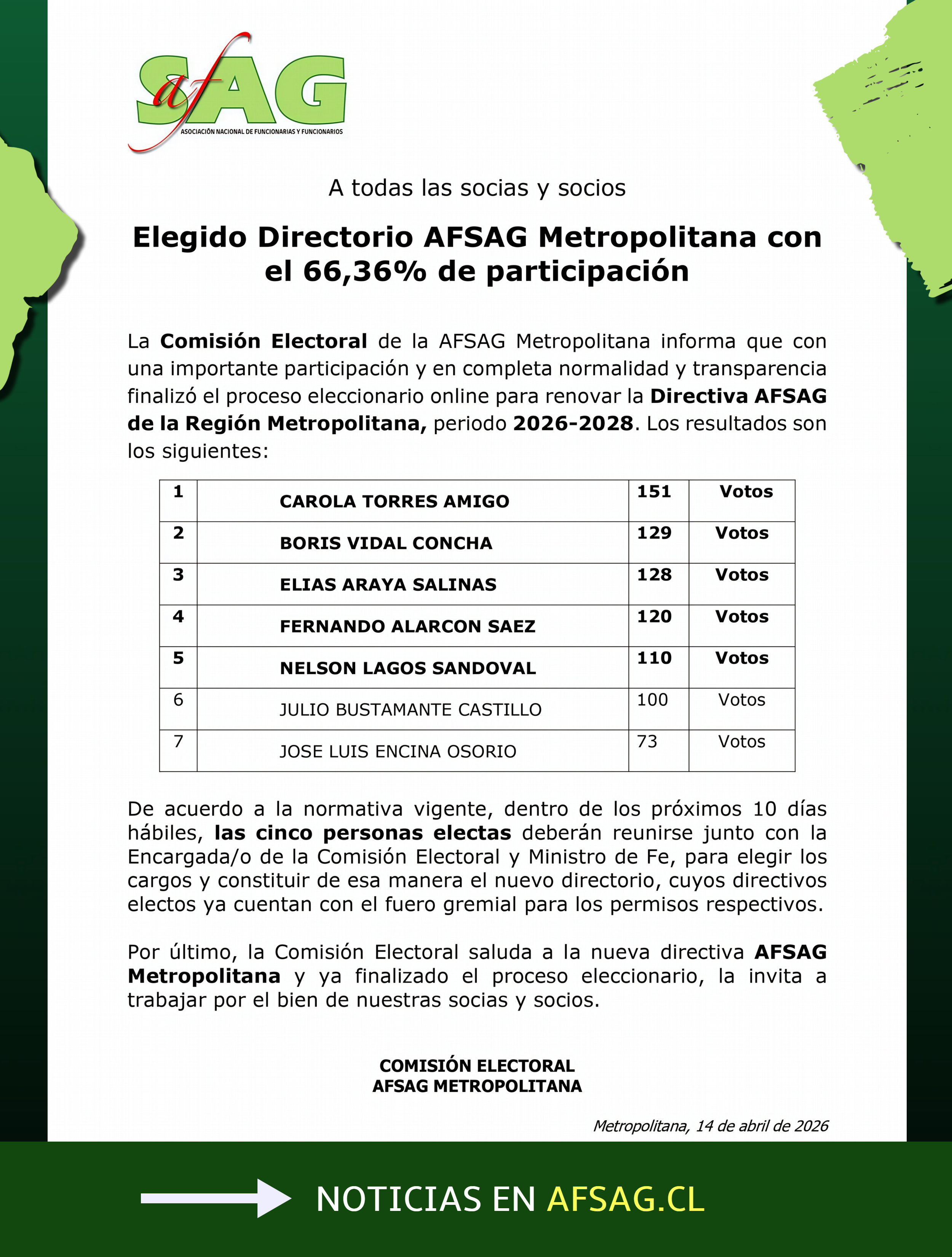 Asociación Nacional de Funcionarias y Funcionarios del Servicio Agrícola y GanaderoFONOS OFICINA AFSAG: 2 64 65 15 70 2 64 65 15 71 2 64 65 15 73 ----- afsag@afsag.cl PASEO BULNES 120 OFICINA 81 - Santiago, Chile