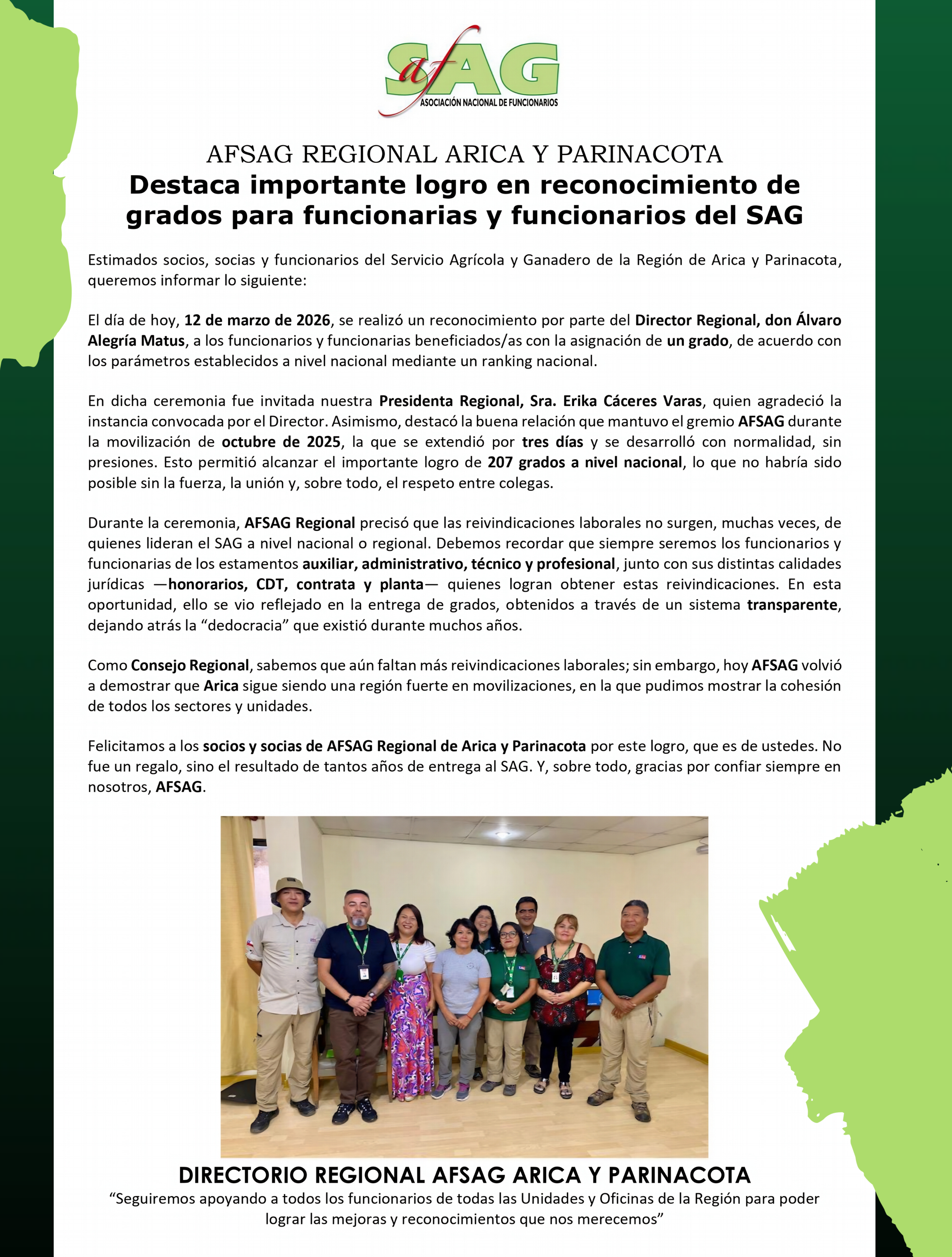 CONSEJO REGIONAL AFSAG PRESIDENTA: ERIKA CÁCERES VARAS erika.caceres@sag.gob.cl SECRETARIA: ALEJANDRA SEGOVIA QUIROZ alejandra.segovia@sag.gob.cl TESORERA: DANIELA BARRERA PEÑA daniela.barrera@sag.gob.cl