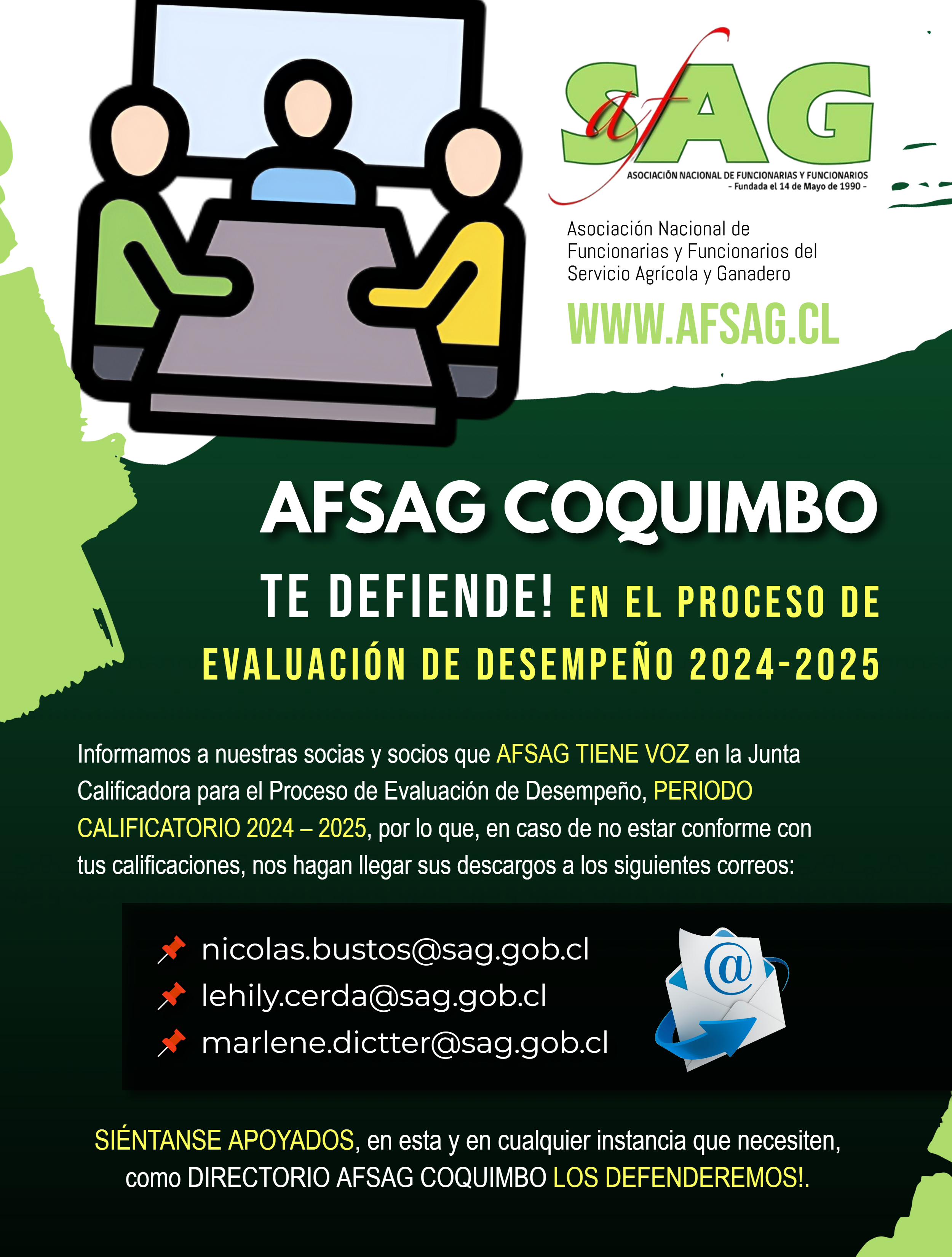 CONSEJO REGIONAL AFSAG PRESIDENTE: NICOLAS BUSTOS BUSTOS nicolas.bustos@sag.gob.cl SECRETARIA: MARLENE DICTTER ÁLVAREZ marlene.dictter@sag.gob.cl TESORERA: LEHILY CERDA ZARRICUETA lehily.cerda@sag.gob.cl