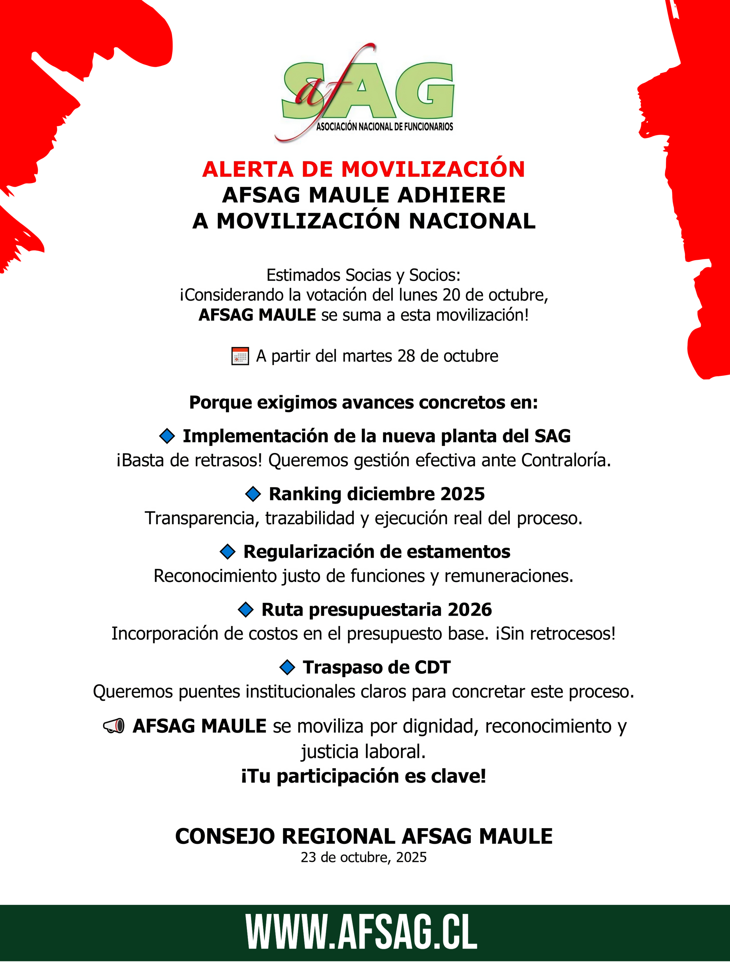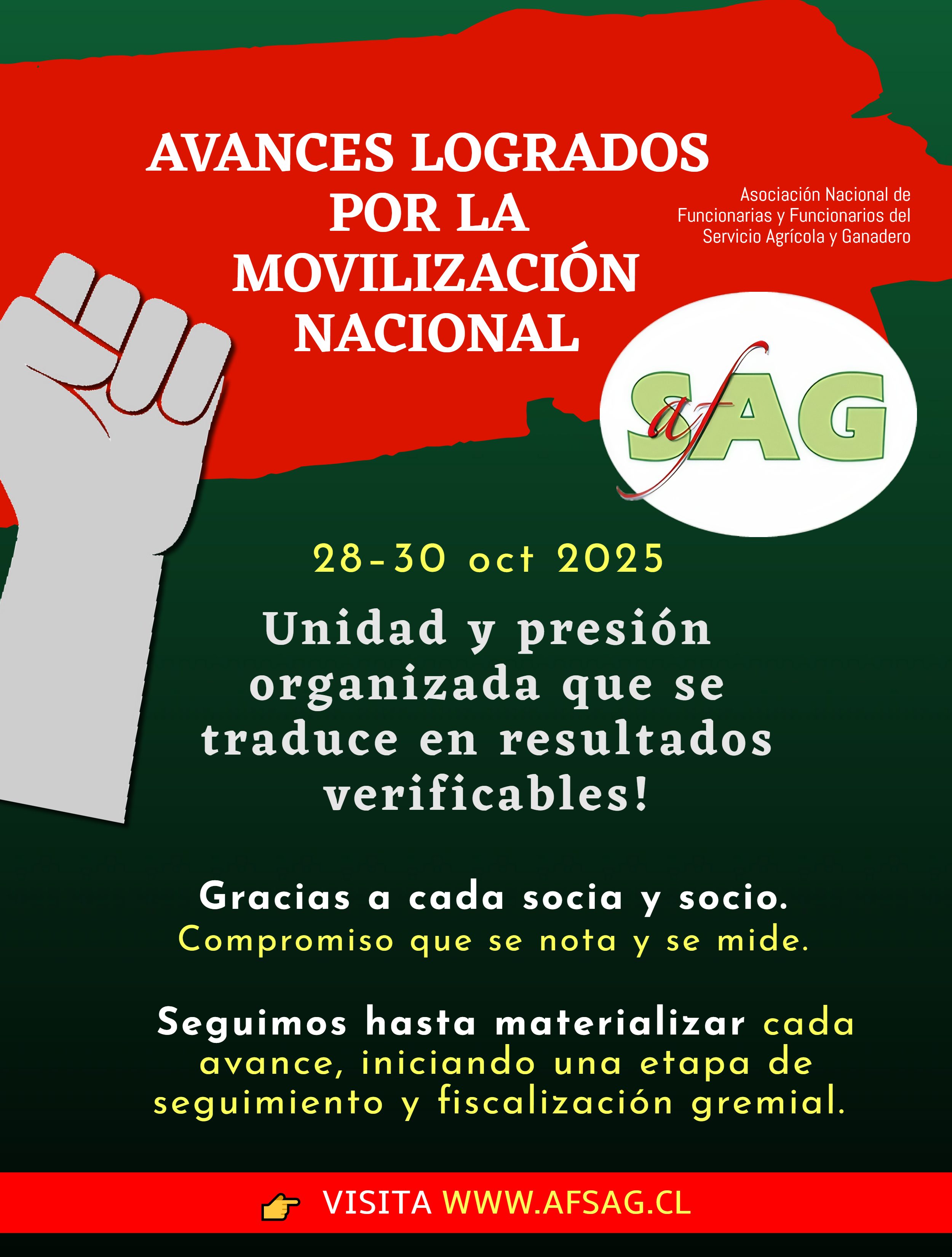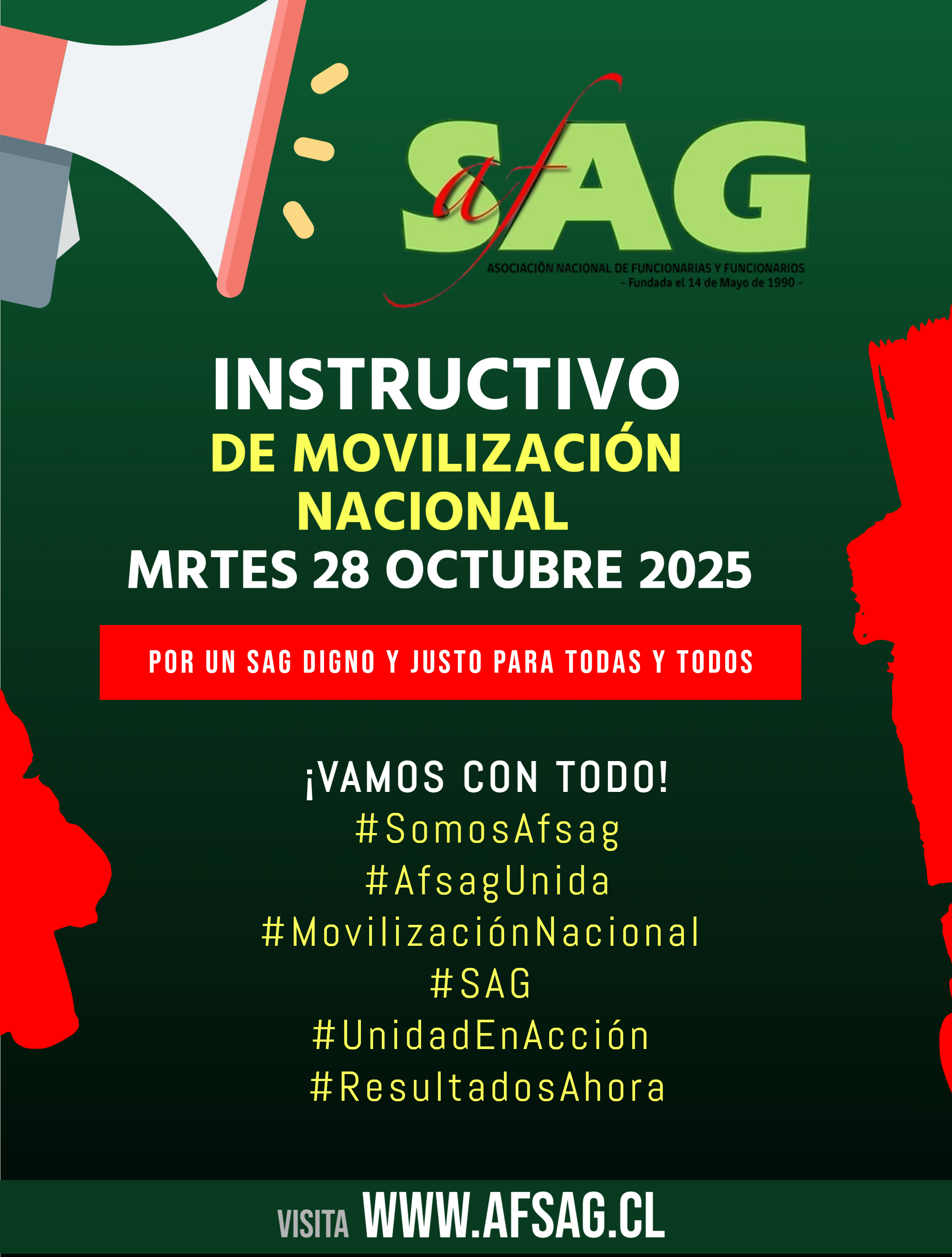 Asociación Nacional de Funcionarias y Funcionarios del Servicio Agrícola y GanaderoFONOS OFICINA AFSAG: 2 64 65 15 70 2 64 65 15 71 2 64 65 15 73 ----- afsag@afsag.cl PASEO BULNES 120 OFICINA 81 - Santiago, Chile