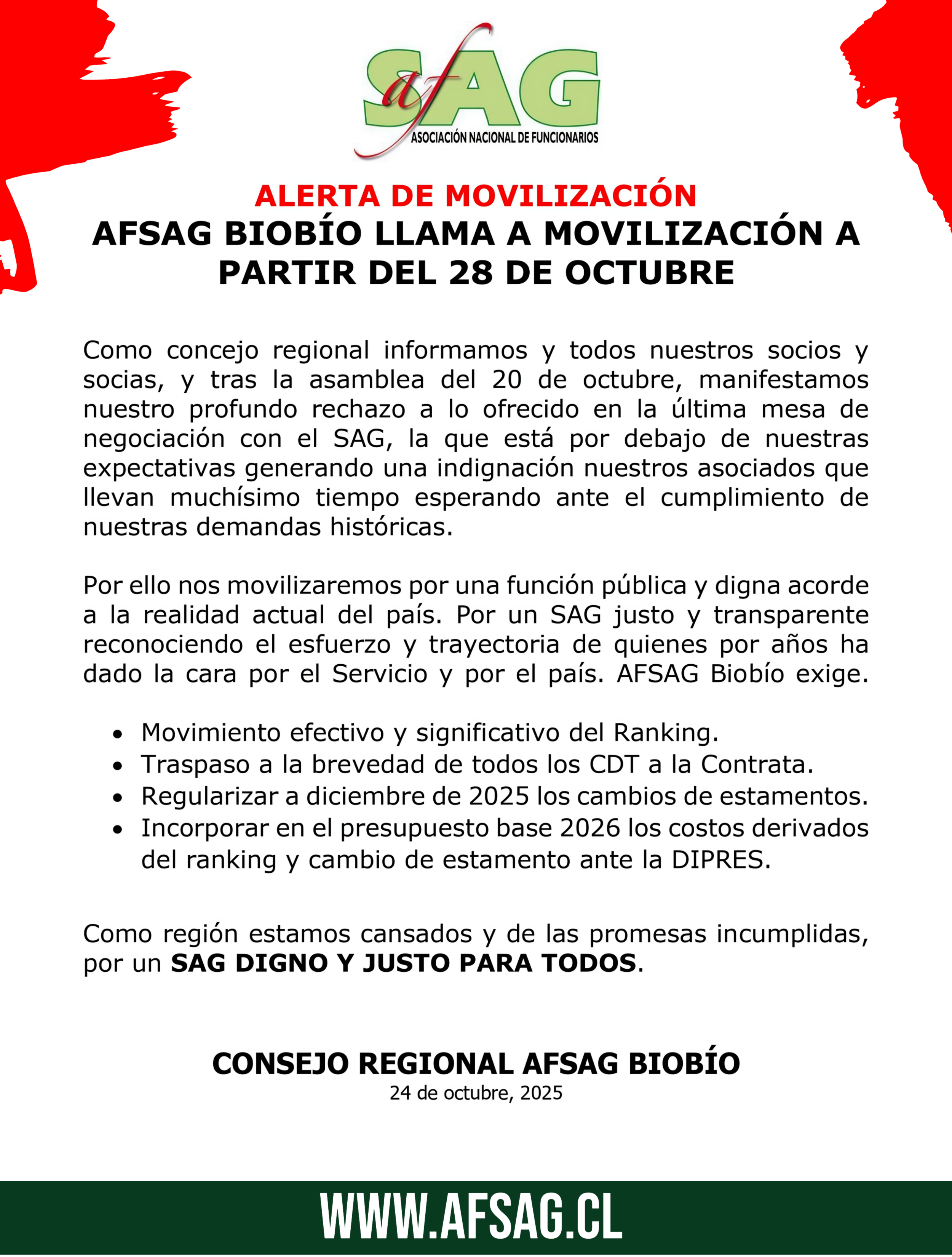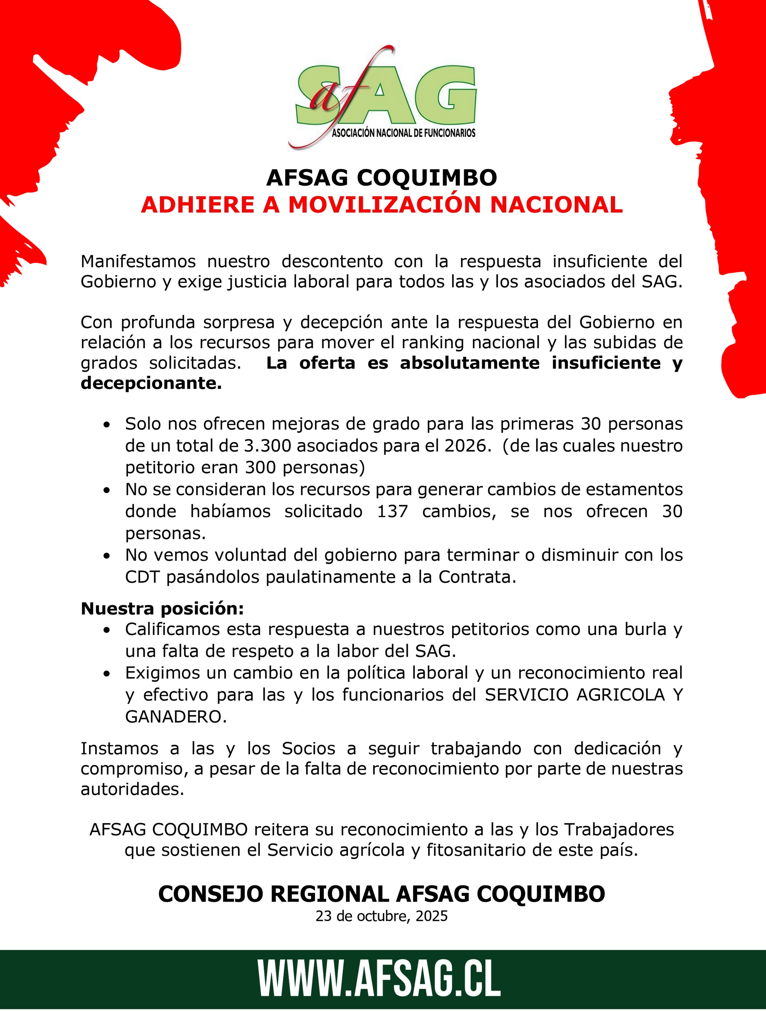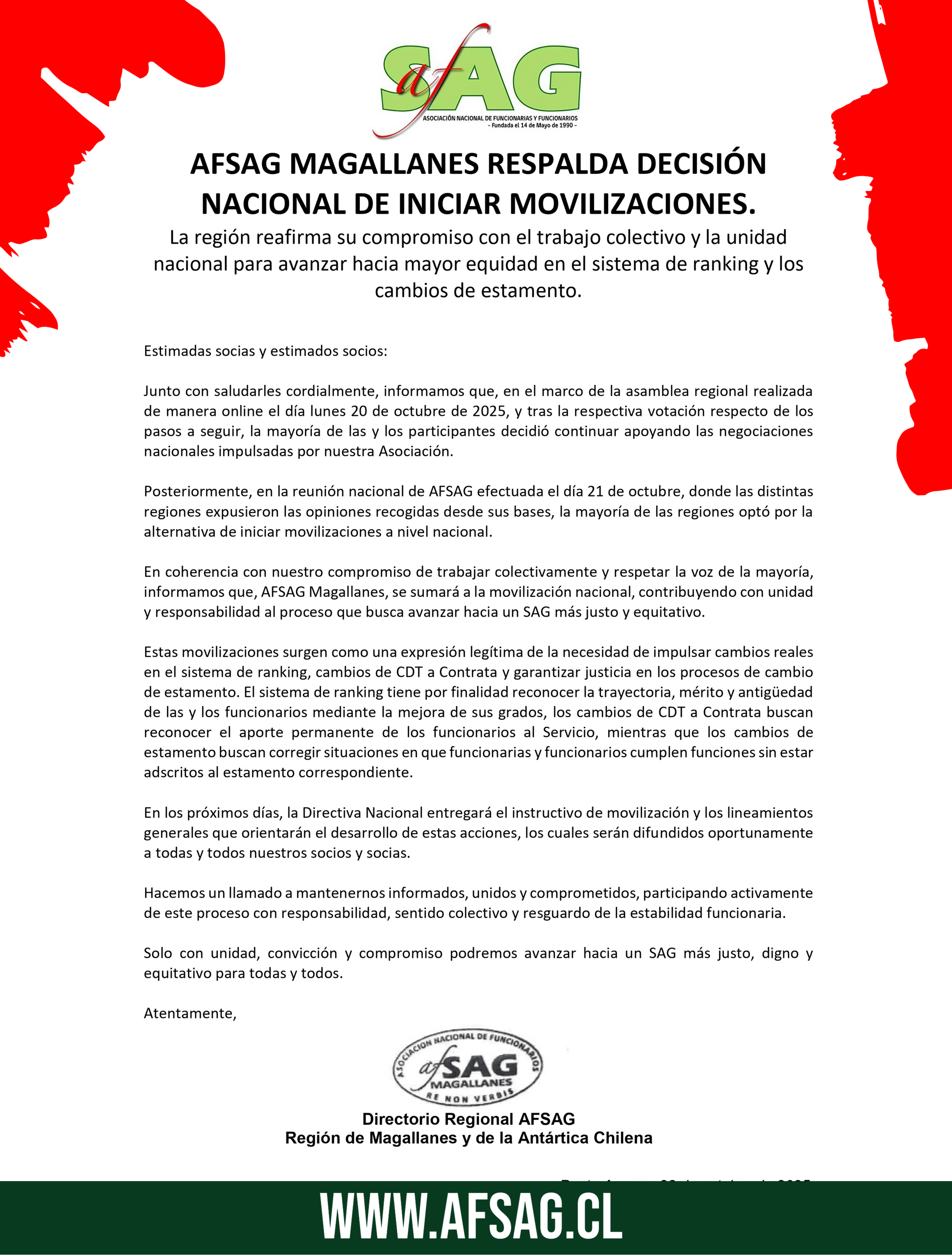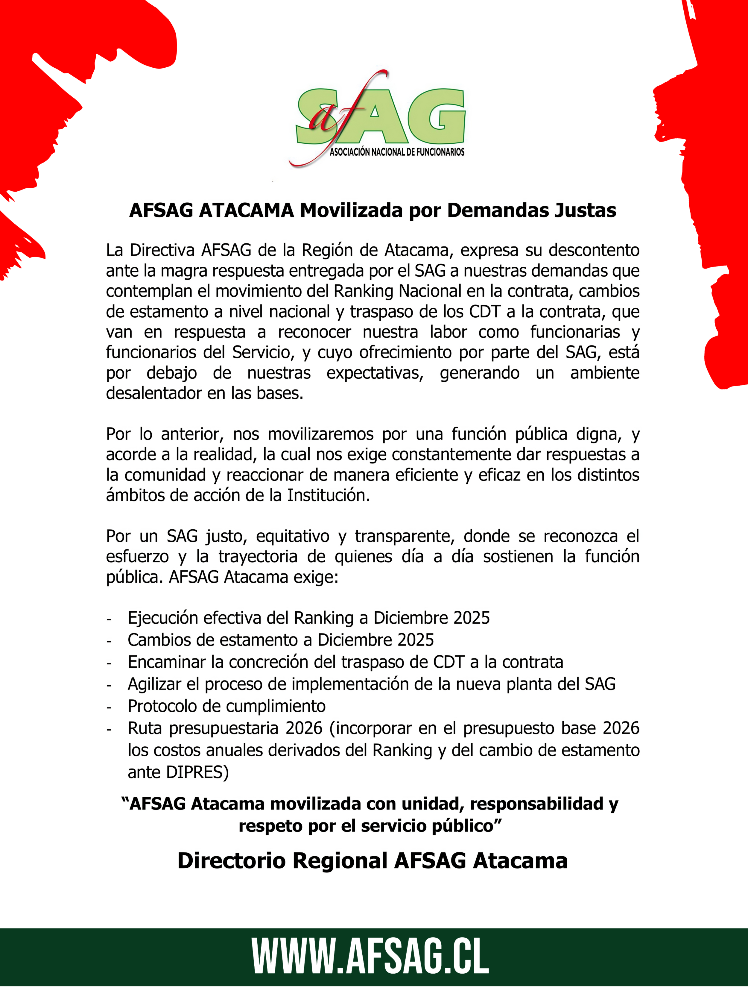 Asociación Nacional de Funcionarias y Funcionarios del Servicio Agrícola y GanaderoFONOS OFICINA AFSAG: 2 64 65 15 70 2 64 65 15 71 2 64 65 15 73 ----- afsag@afsag.cl PASEO BULNES 120 OFICINA 81 - Santiago, Chile