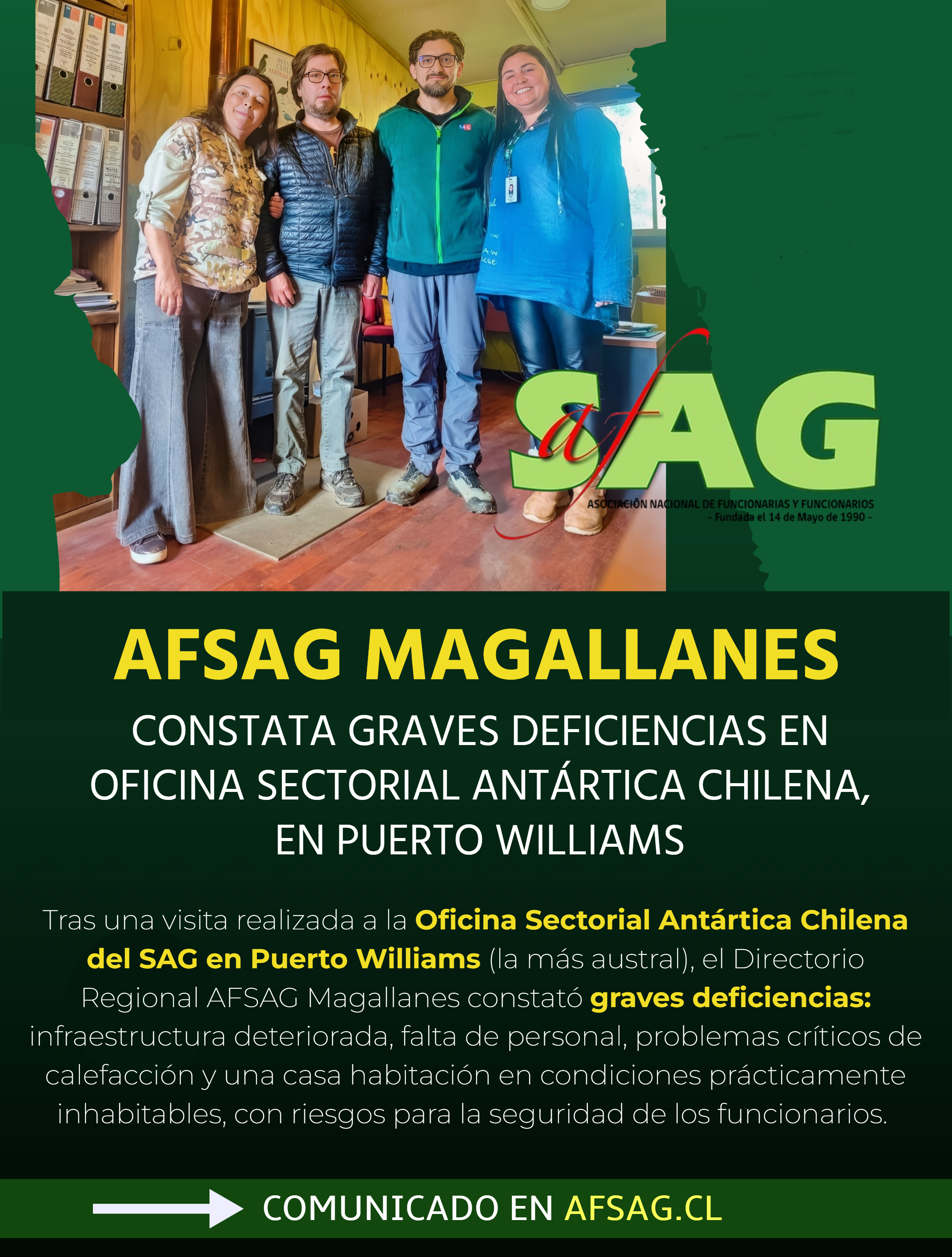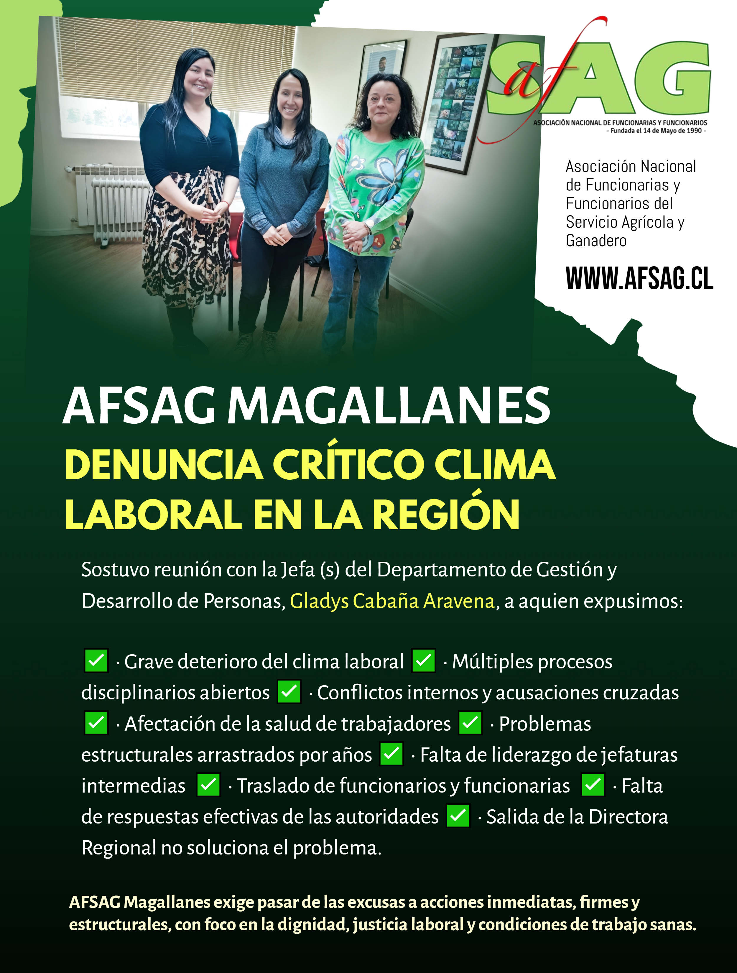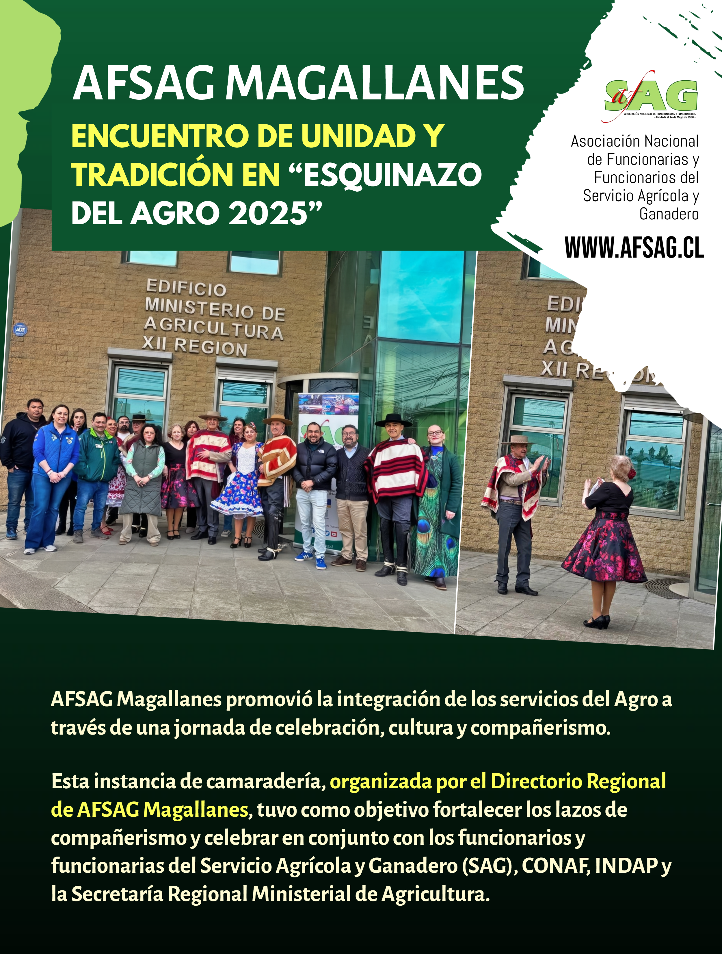 Asociación Nacional de Funcionarias y Funcionarios del Servicio Agrícola y GanaderoFONOS OFICINA AFSAG: 2 64 65 15 70 2 64 65 15 71 2 64 65 15 72 (contador) 2 64 65 15 73 ----- afsag@afsag.cl PASEO BULNES 120 OFICINA 81 - Santiago, Chile
