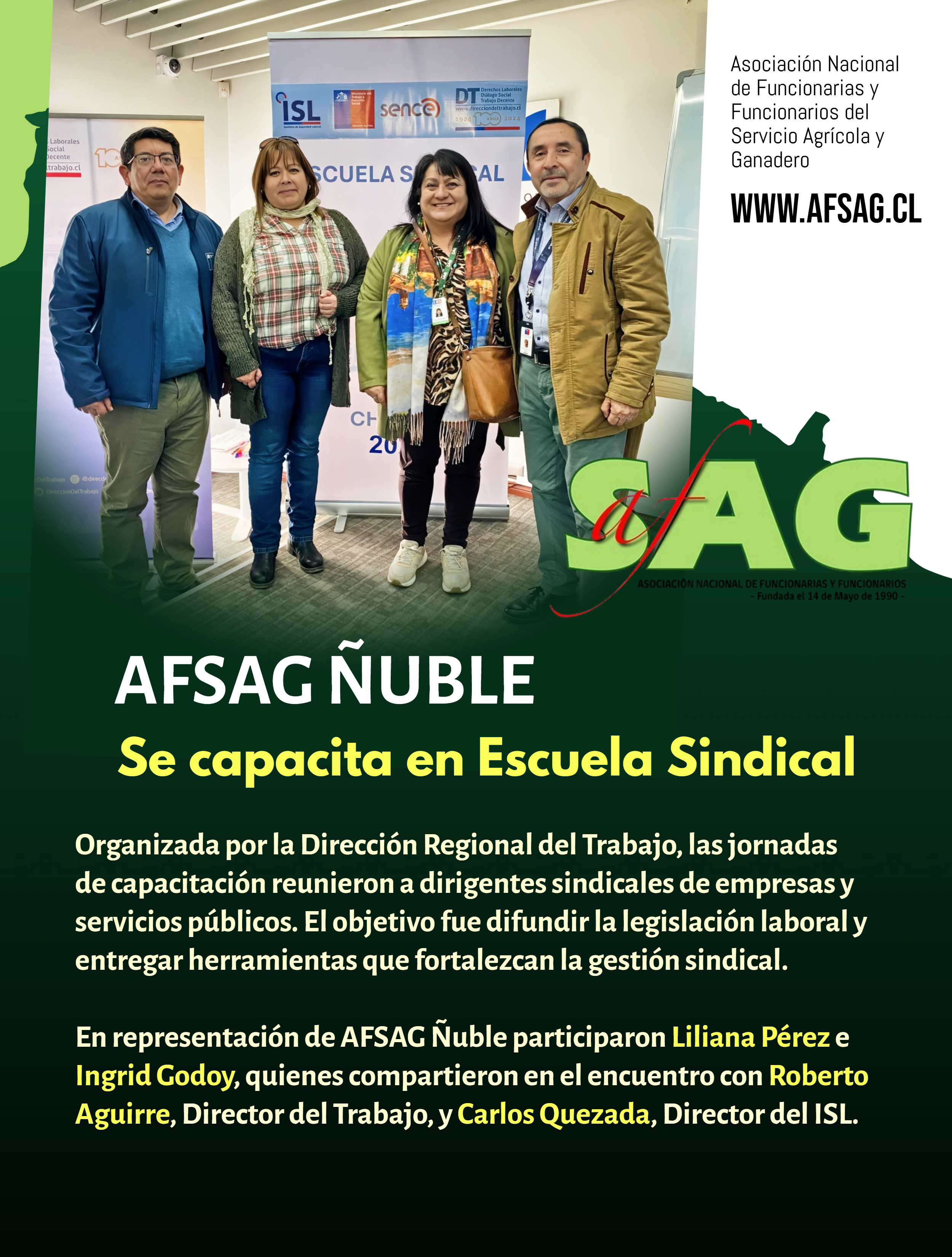 Asociación Nacional de Funcionarias y Funcionarios del Servicio Agrícola y GanaderoFONOS OFICINA AFSAG: 2 64 65 15 70 2 64 65 15 71 2 64 65 15 72 (contador) 2 64 65 15 73 ----- afsag@afsag.cl PASEO BULNES 120 OFICINA 81 - Santiago, Chile
